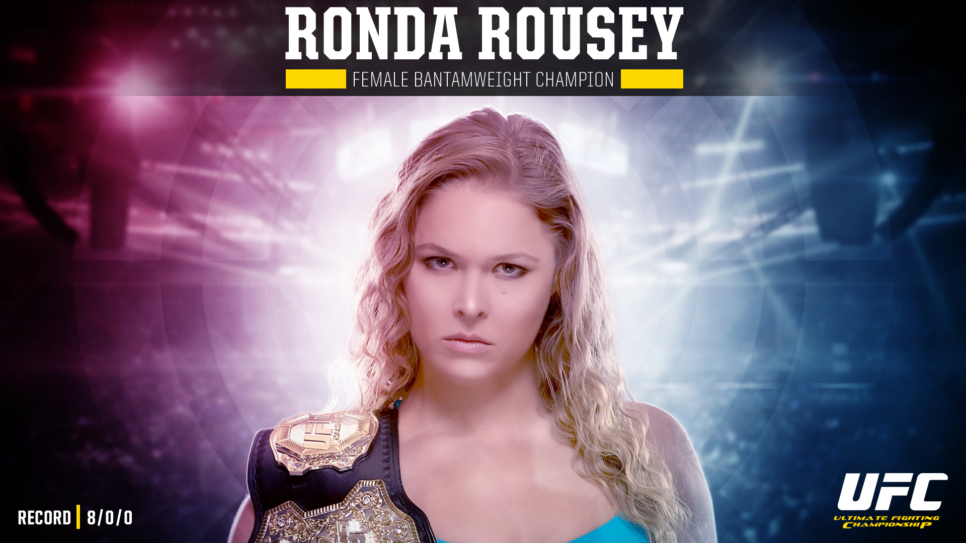 Description: A woman in a blue top and a black and yellow belt is posing for a photo with a purple background.