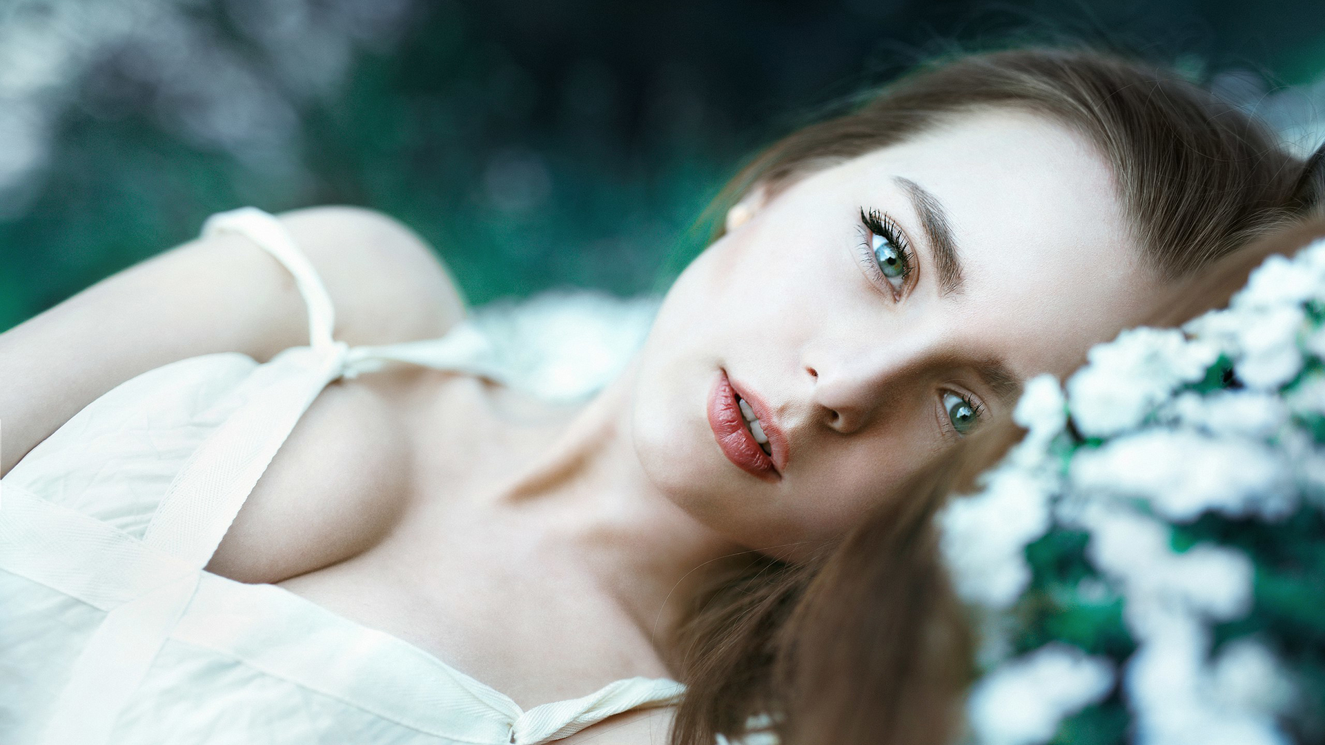 Description: A woman with blue eyes is posing for a picture with flowers in her hand and a white dress on.