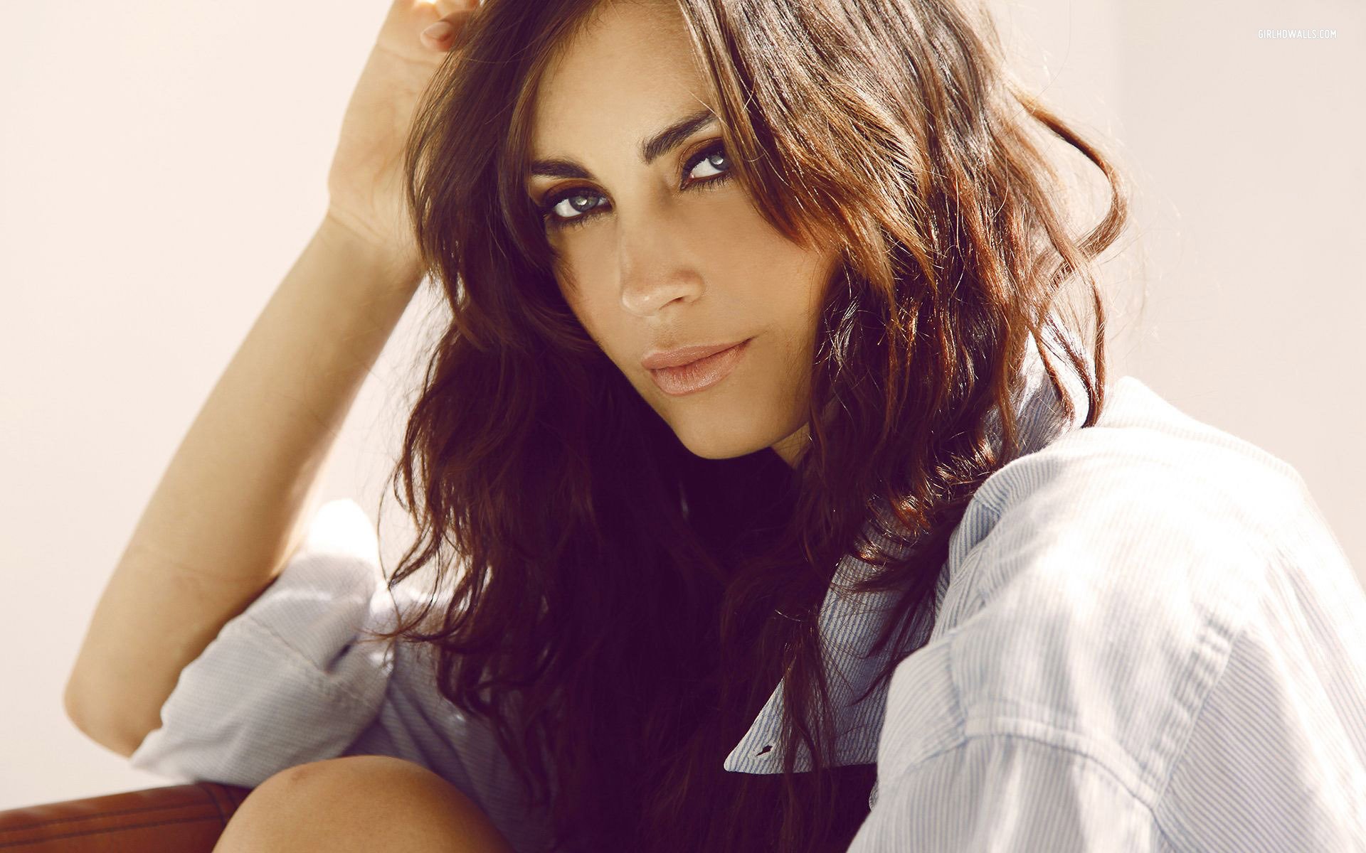 Description: A woman with long hair and blue eyes posing for a picture with her hands on her head and her hair in the air.