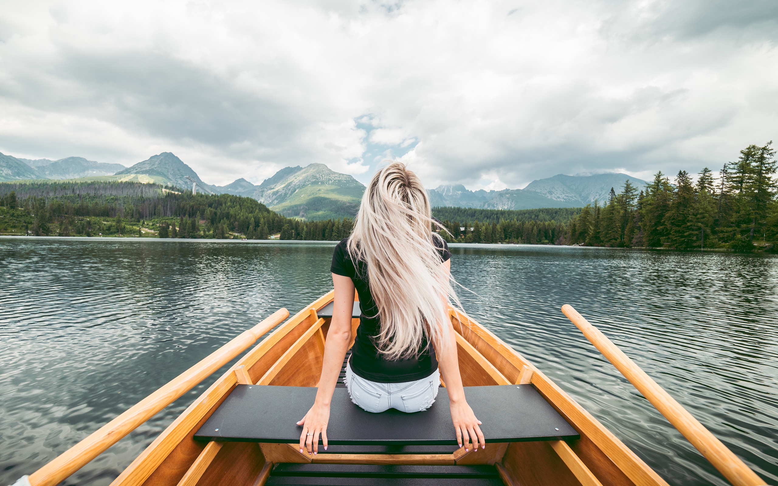 Description: A woman sitting in a boat on a lake with mountains in the background and clouds in the sky above.