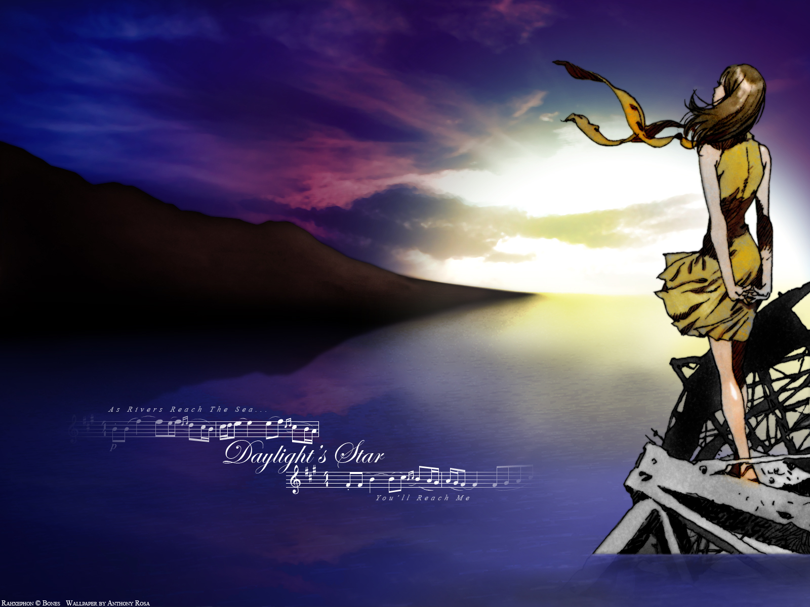 Description: A woman standing on top of a boat in the water with music notes flying around her and a sunset in the background.