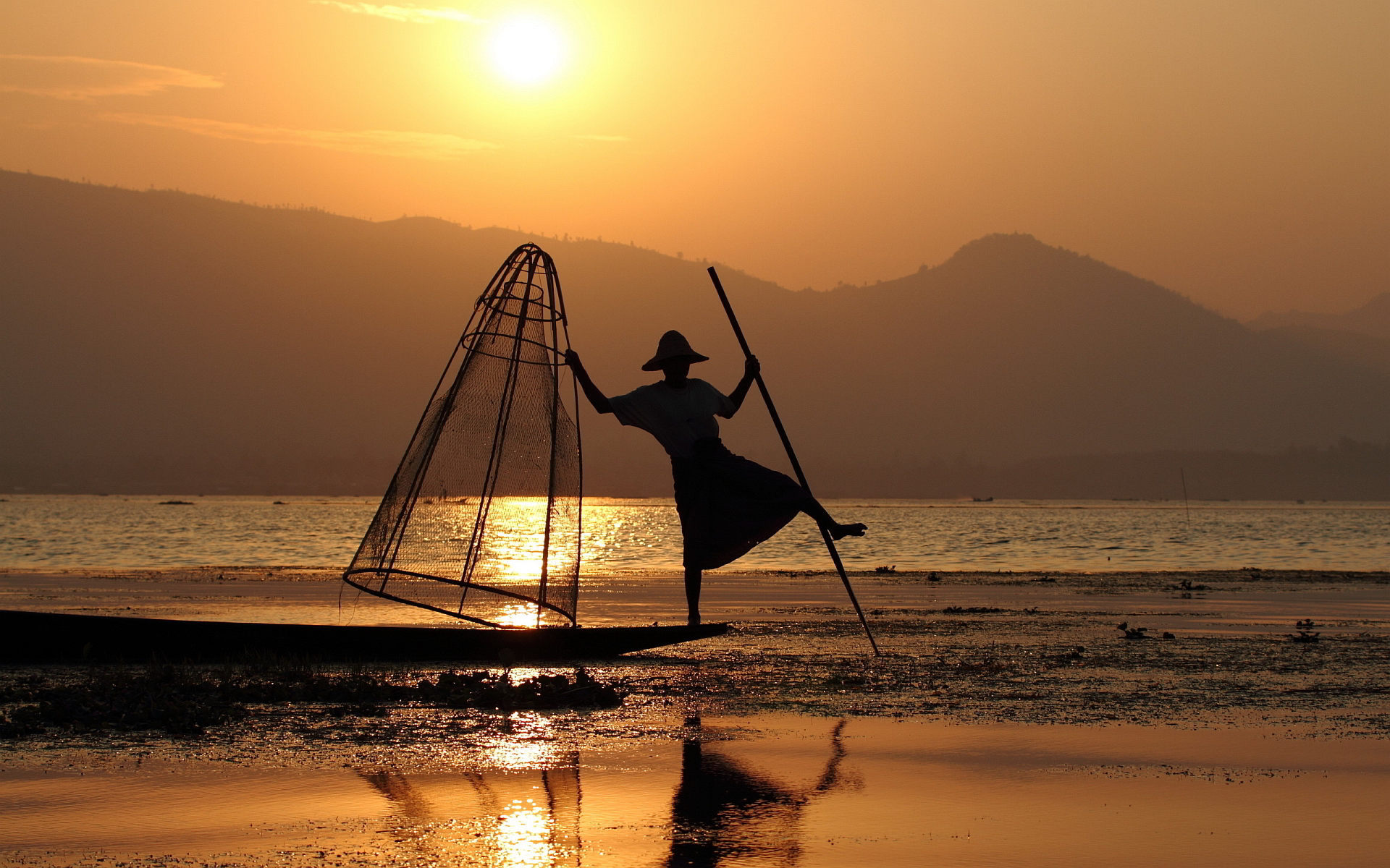Description: A woman standing on a boat holding a pole and a net in the water at sunset with mountains in the background.