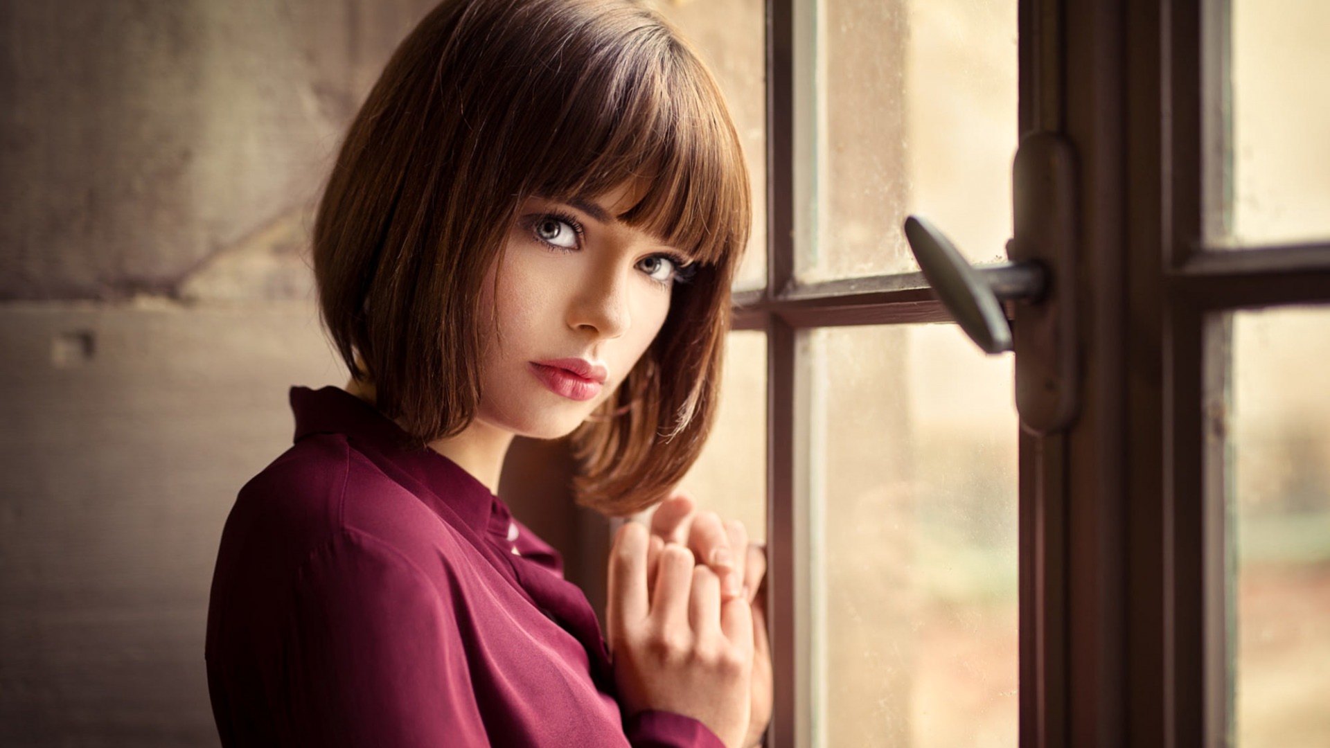 Description: A woman with a short bobble haircut standing by a window looking out the window at the outside.
