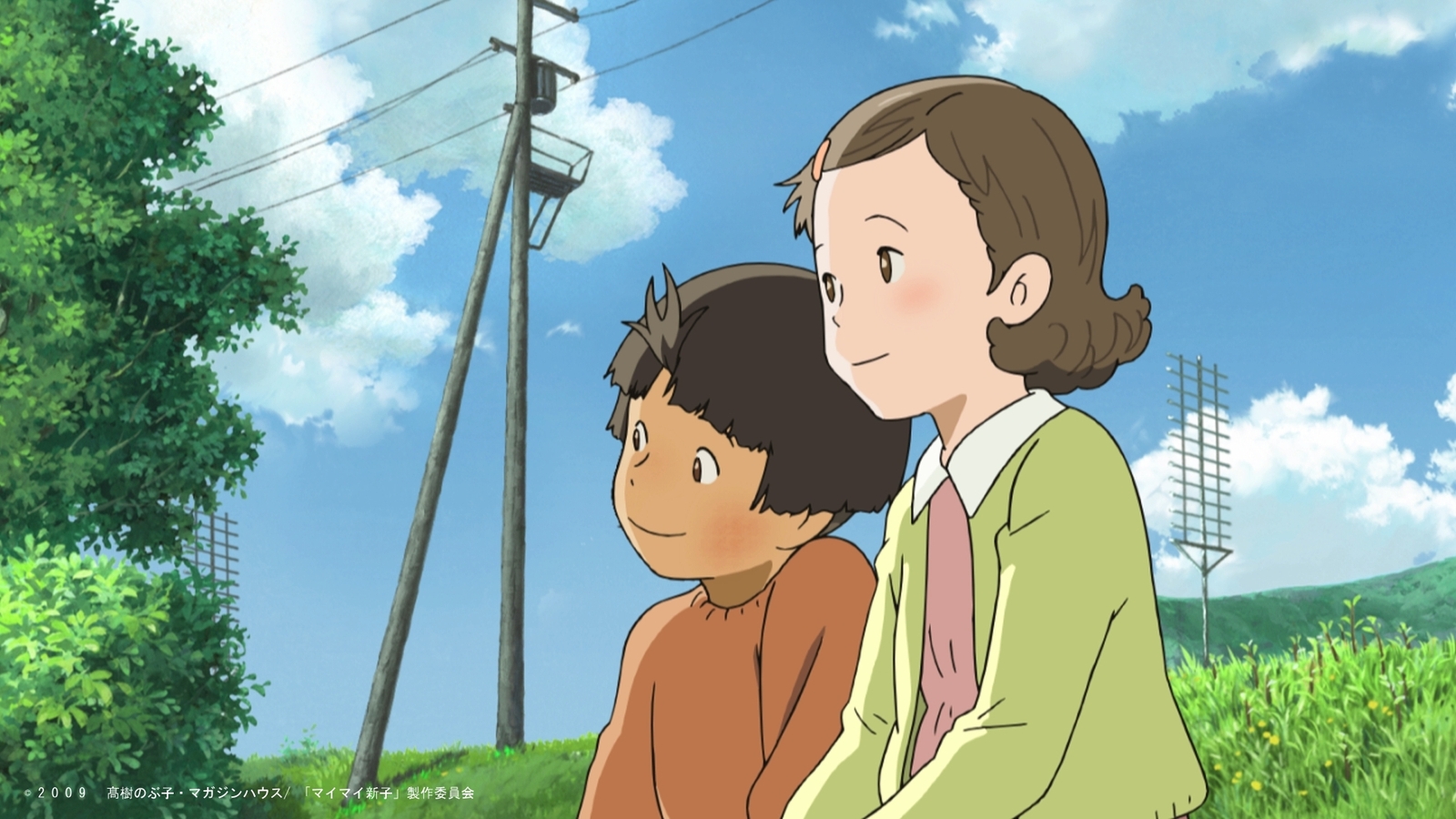Description: A woman and a boy sitting on a bench in a field with power lines in the background and a sky with clouds.