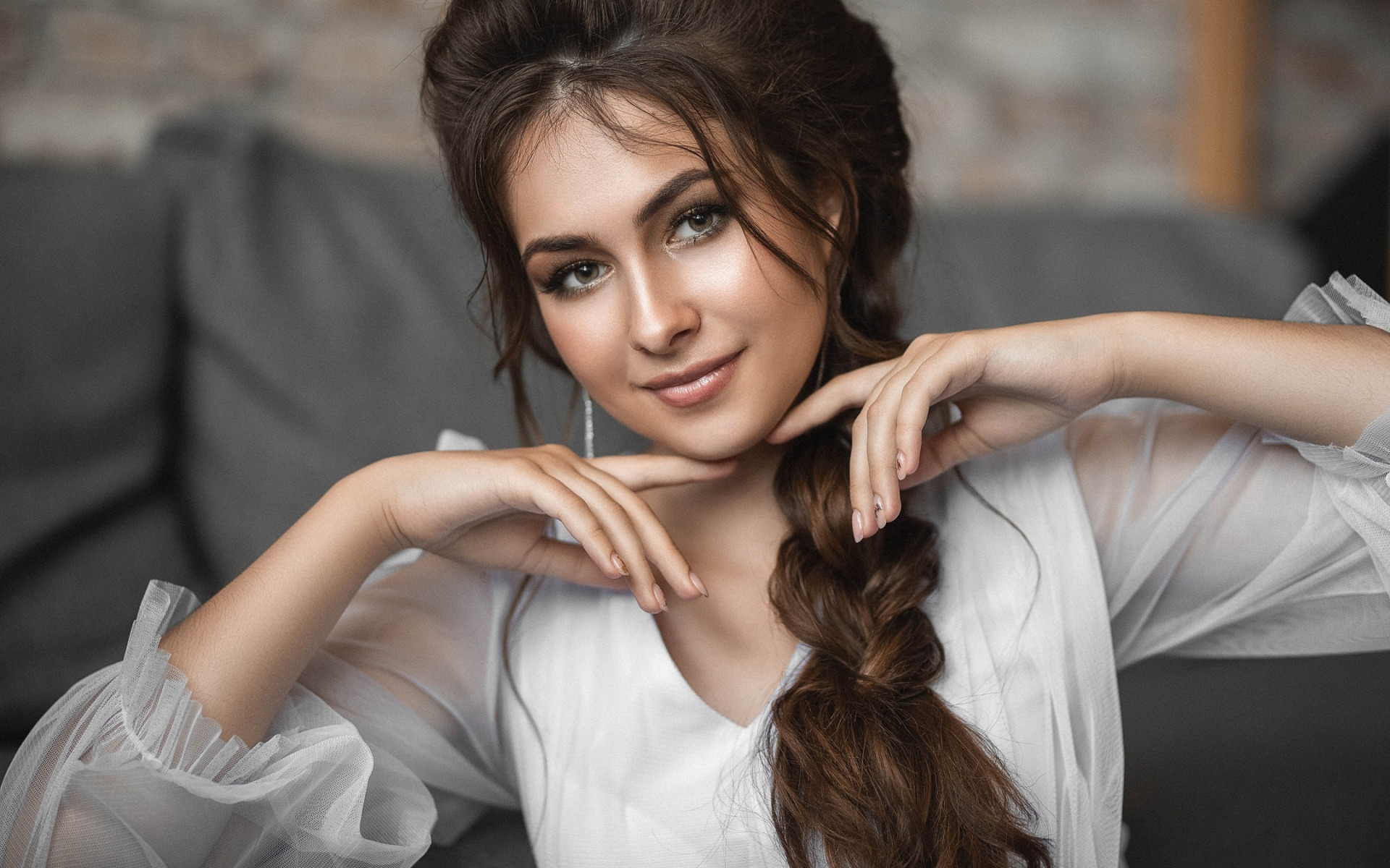 Description: A woman with a long braid sitting on a couch with her hands on her hips and looking at the camera.