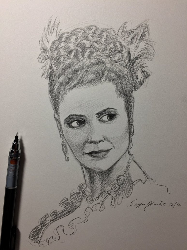 Description: A drawing of a woman with a braid in her hair and a necklace on her neck.