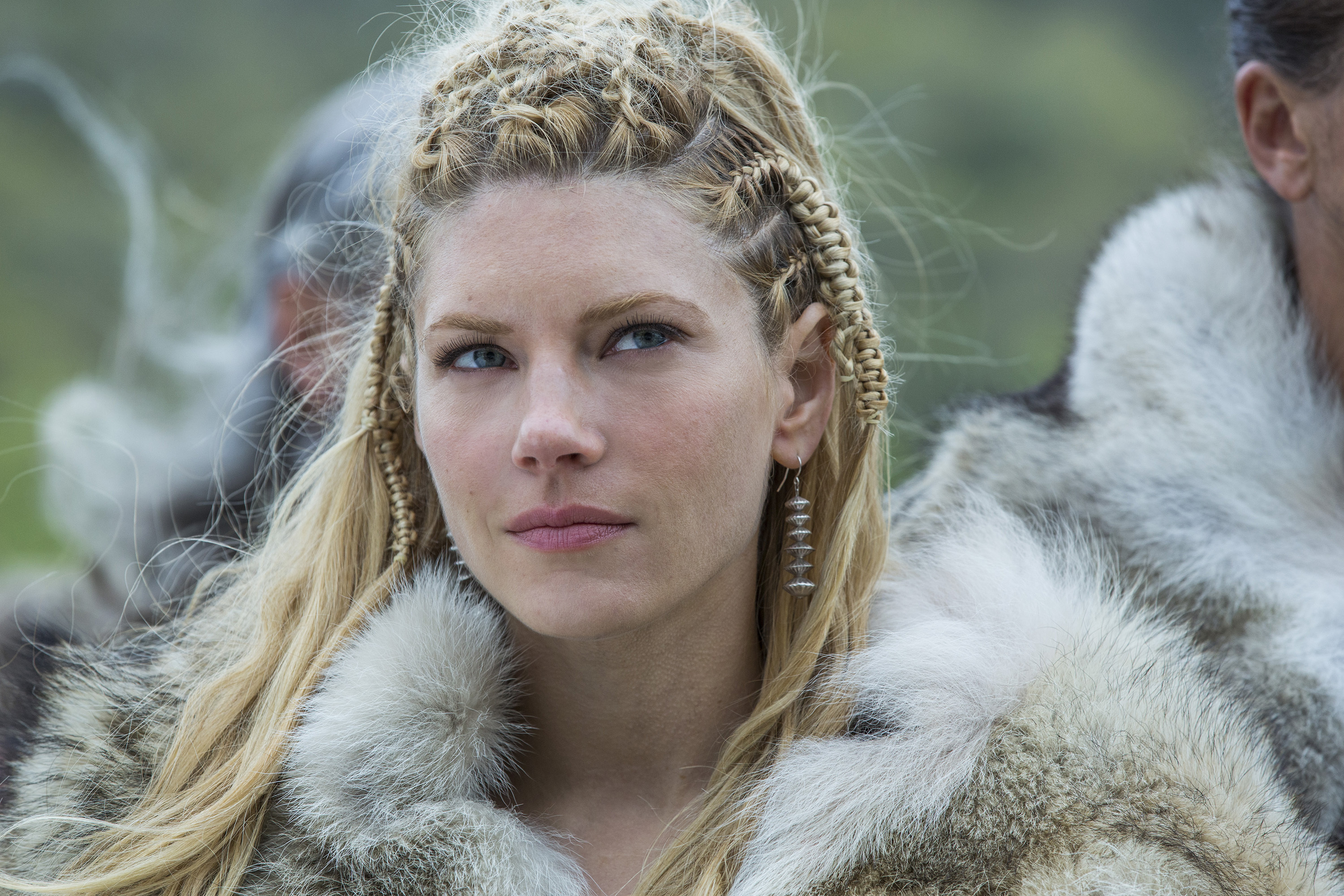 Description: A woman with long hair and braids wearing a fur coat and smoking a cigarette in front of a man.