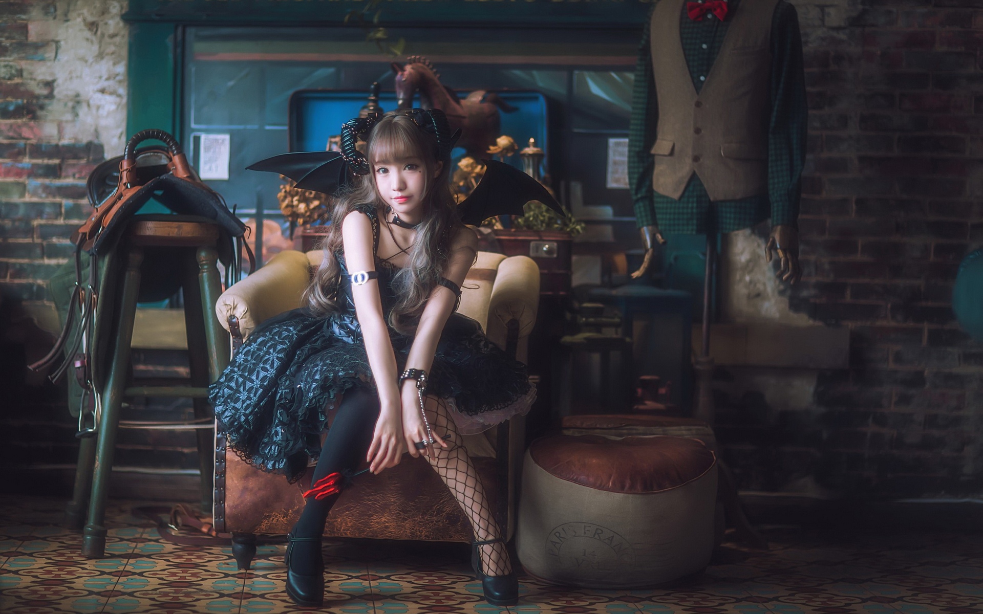 Description: A woman sitting on a chair in a room with a brick wall and a clock on the wall behind her.
