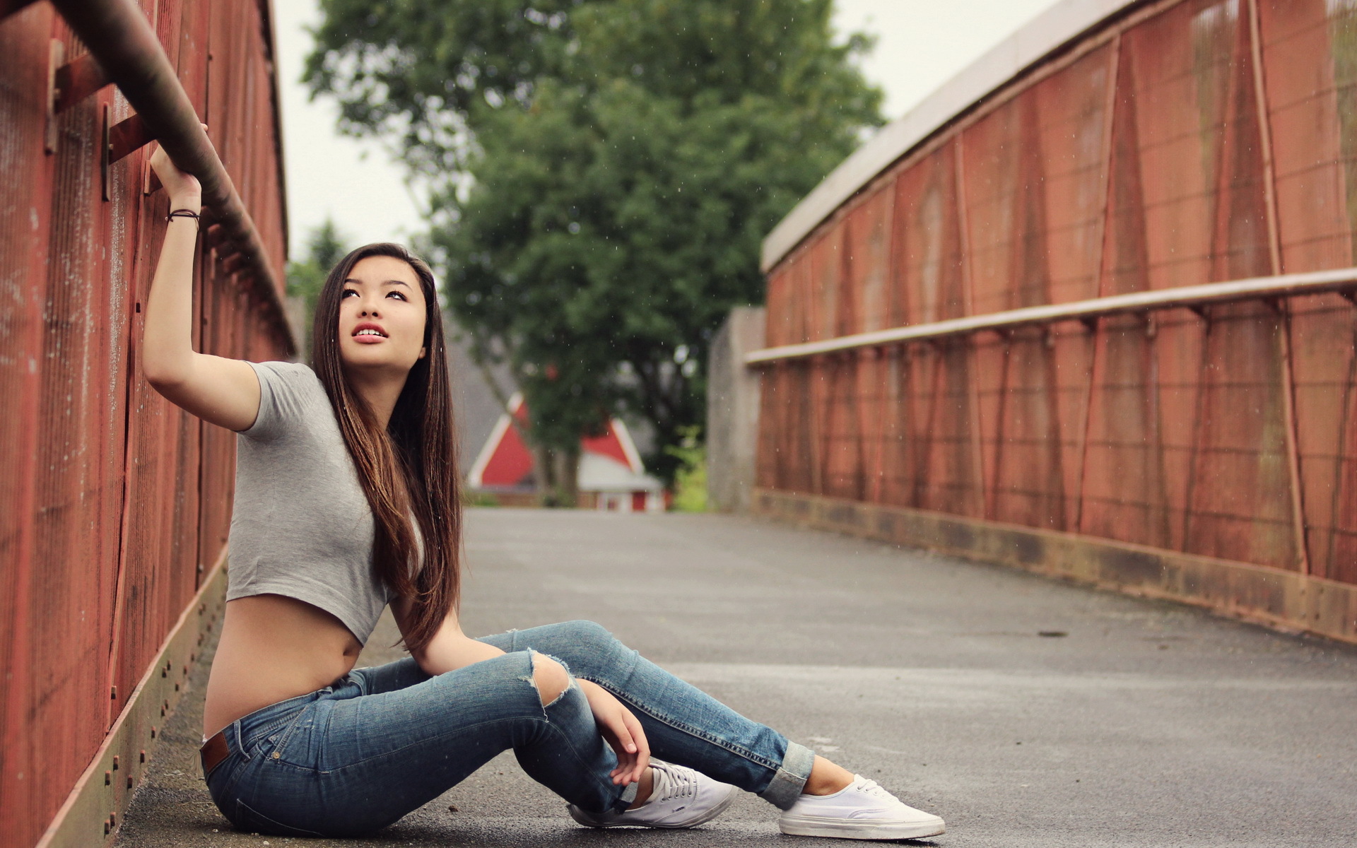 Description: A woman sitting on the ground next to a brick wall and leaning against a wall with her hand on her hip.