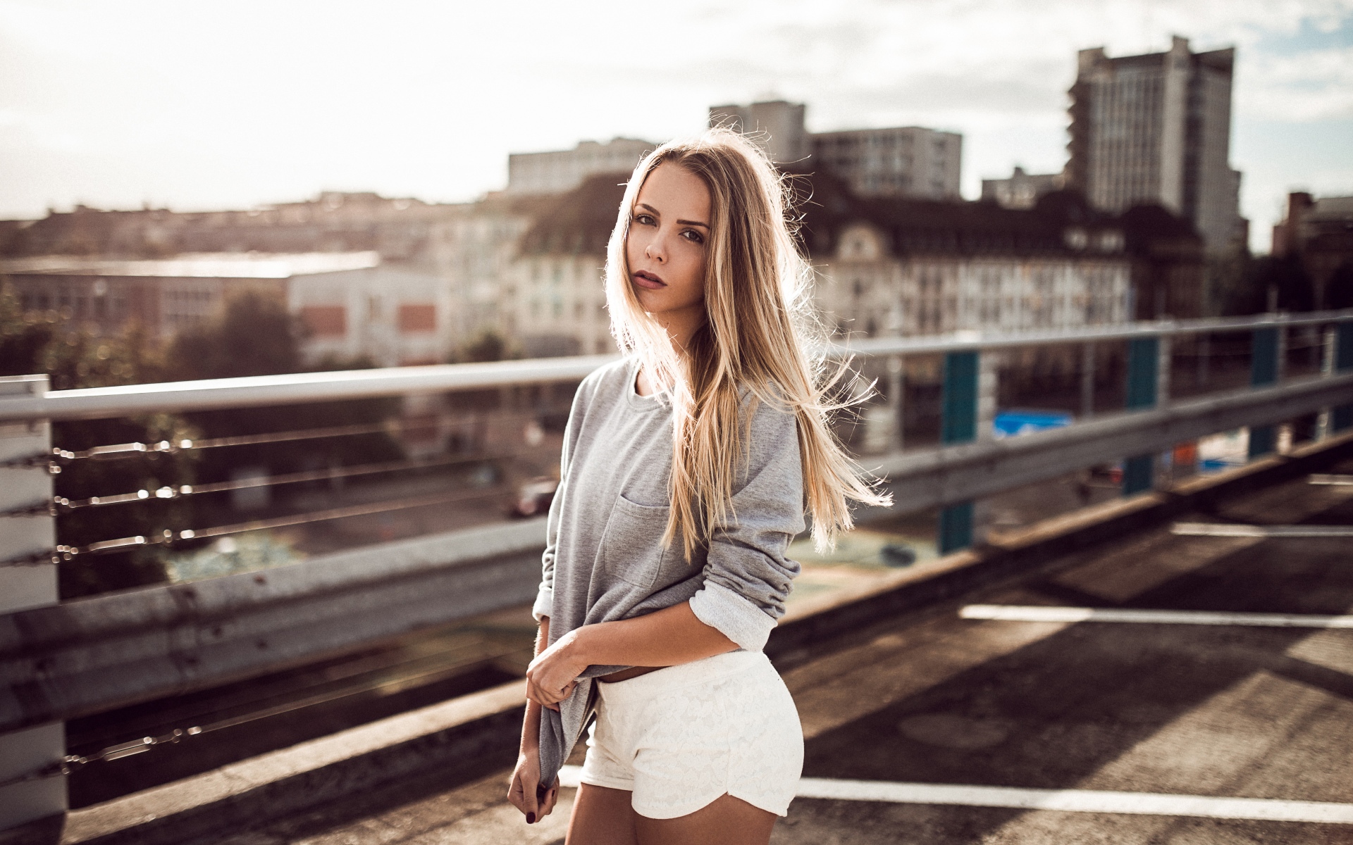 Description: A woman in a short skirt is standing on a bridge with a city in the background and a train on the tracks.