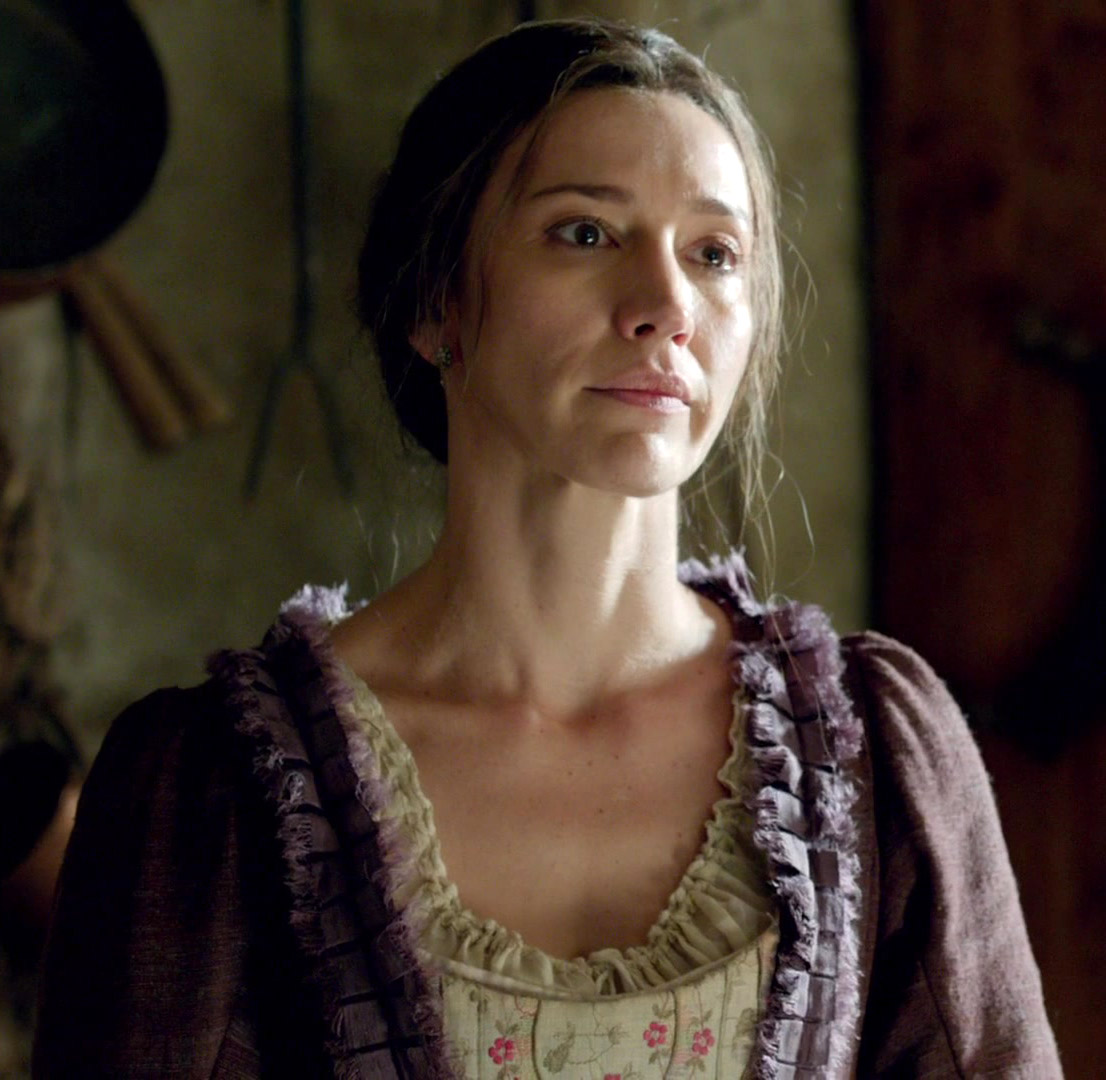 Description: A woman in a brown dress and a hat looking off to the side with a serious look on her face.