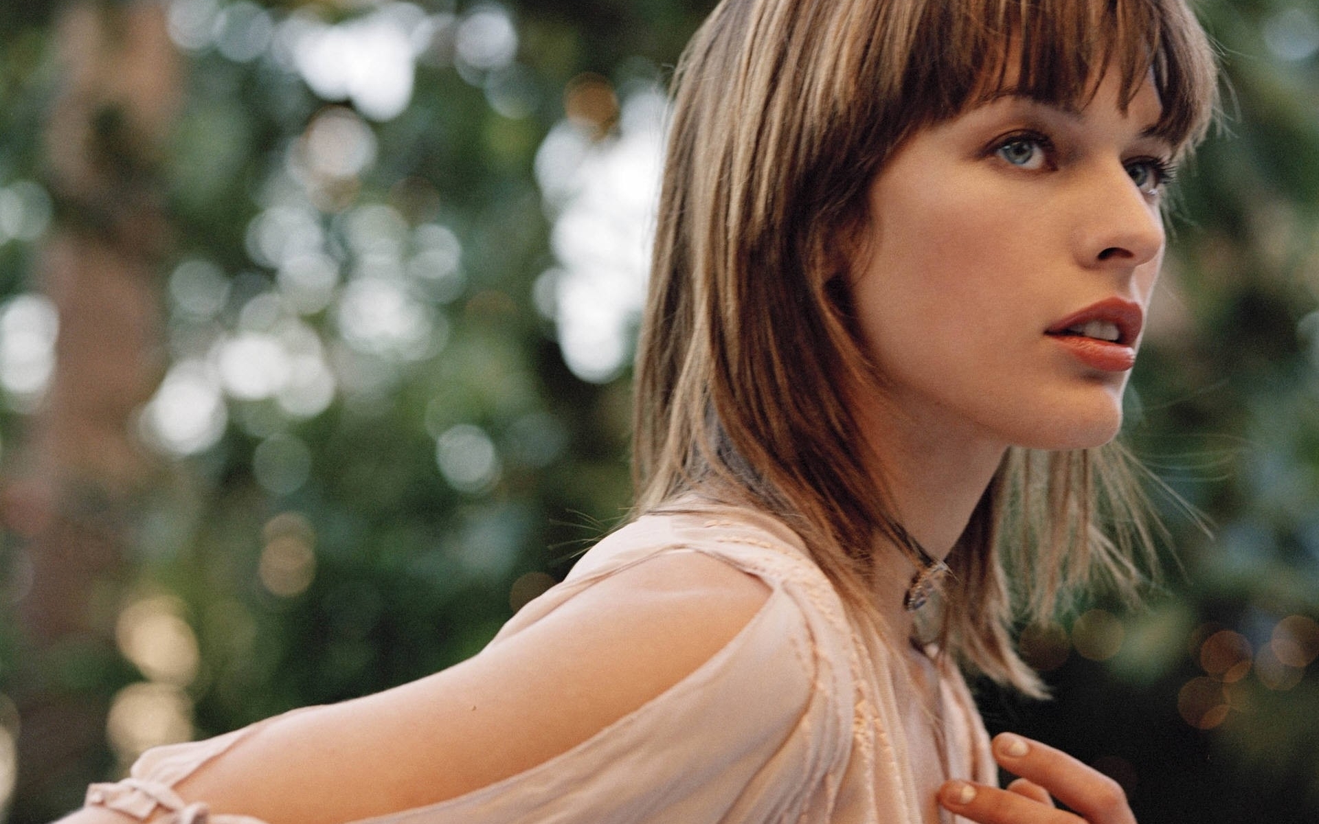 Description: A woman with a shoulder length dress and a necklace on her neck is looking away from the camera with a serious look on her face.