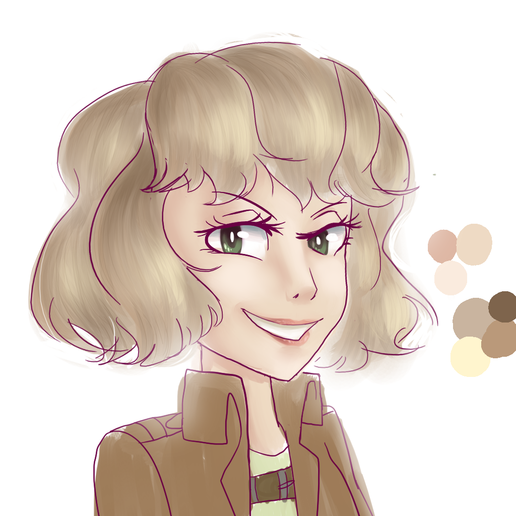 Description: A drawing of a woman with a brown jacket and green shirt and a brown jacket with a green shirt and a brown jacket.