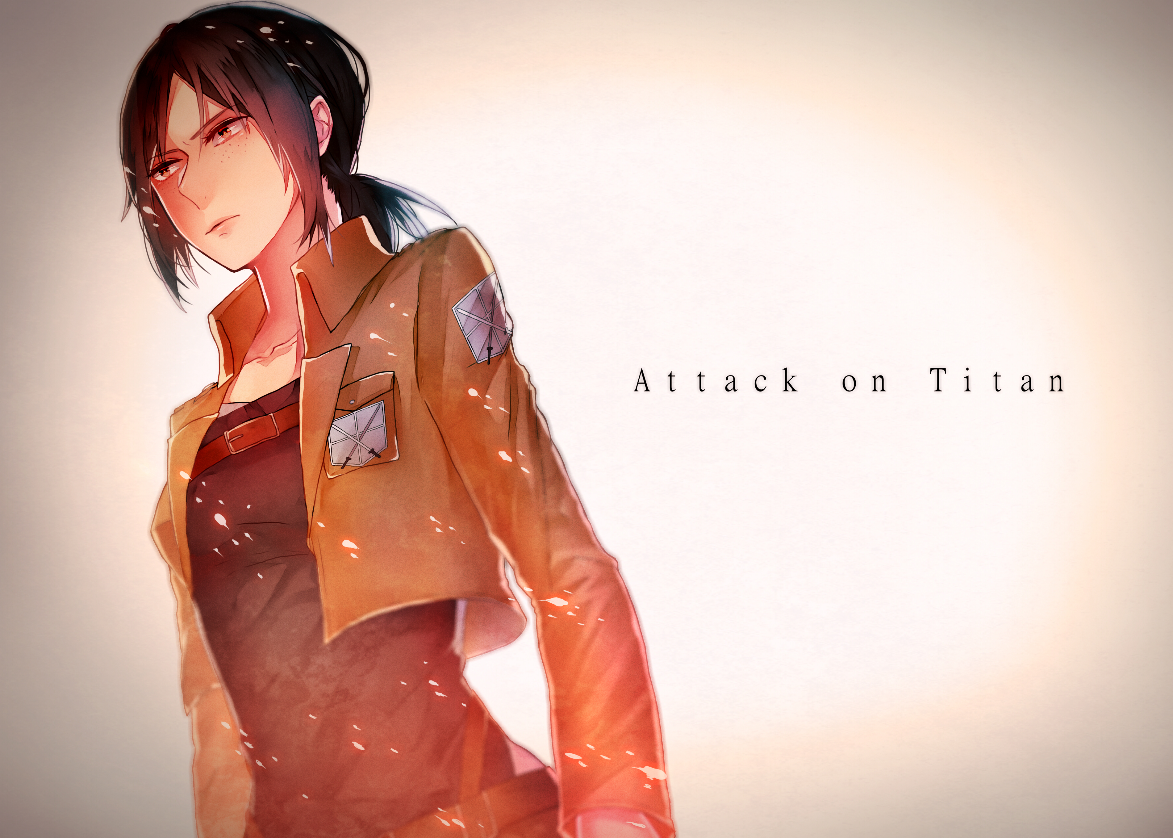 Description: A woman in a brown jacket and a white background with words that read attack on titan on it.