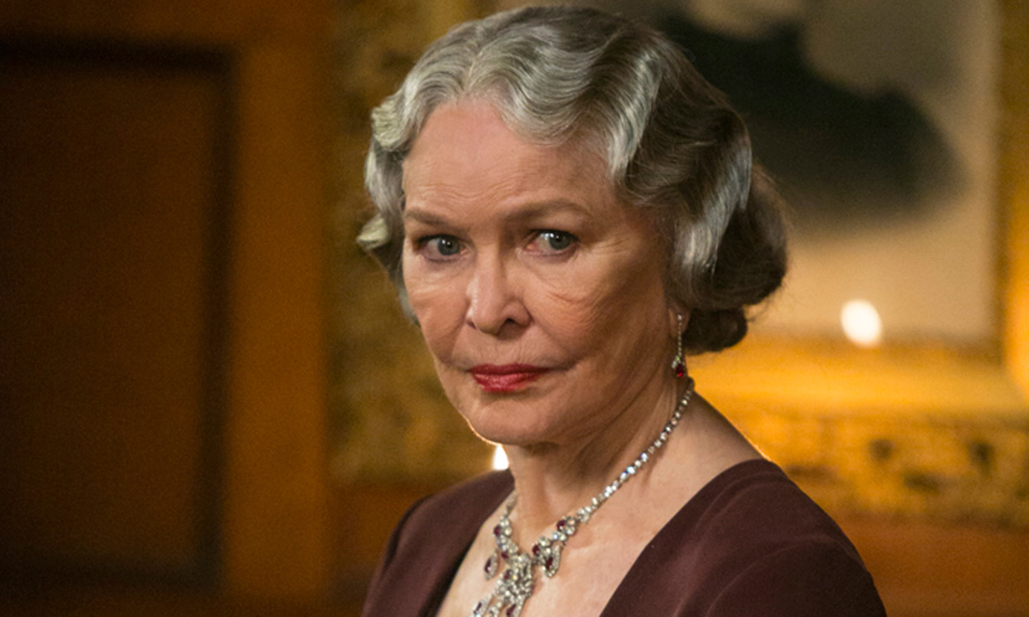 Description: A woman in a brown dress and a necklace on her neck and chest.