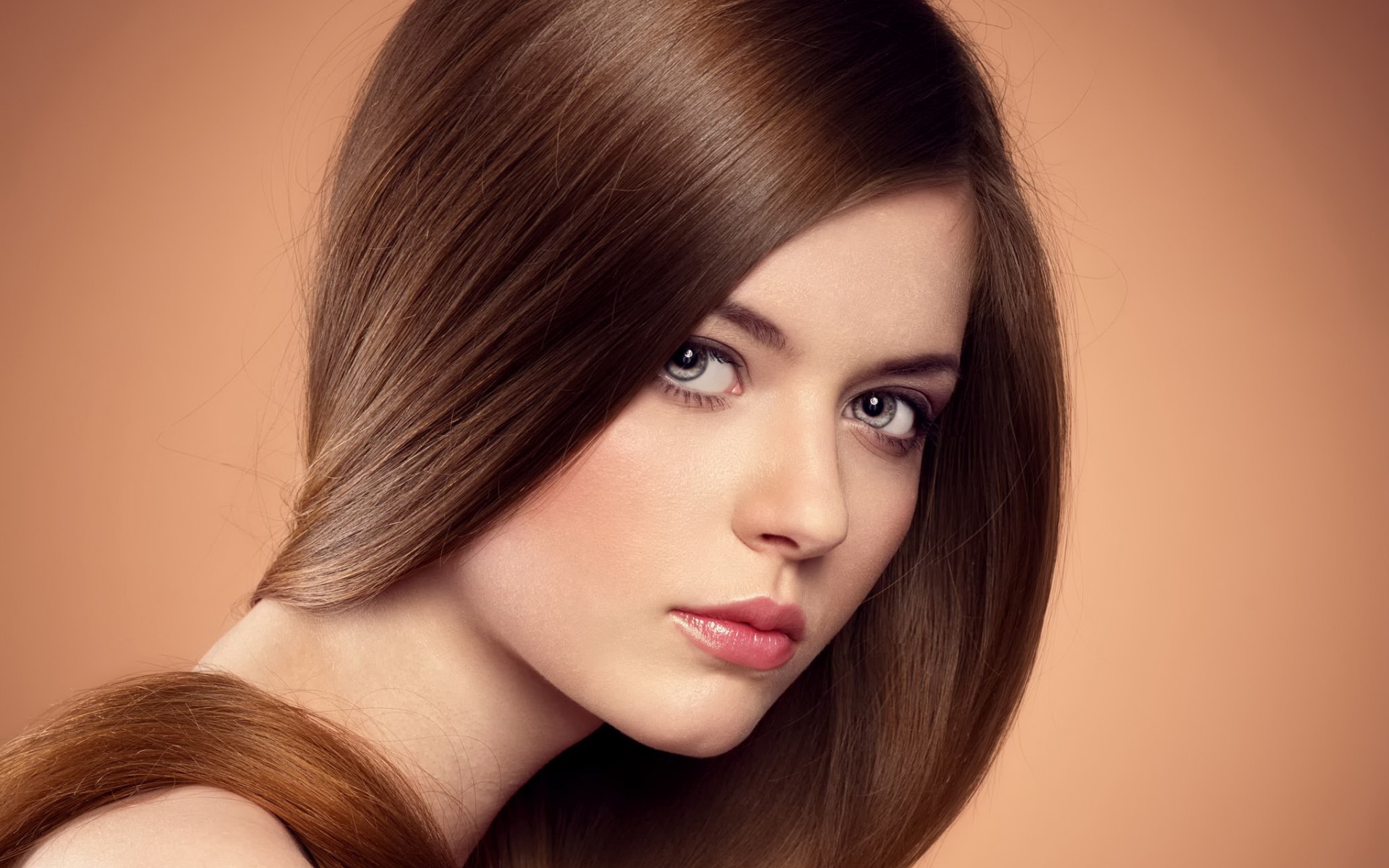 Description: A woman with long brown hair and a brown background is looking at the camera with a serious look on her face.
