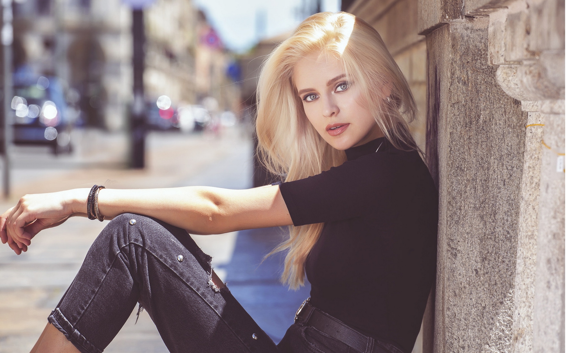 Description: A woman sitting on the side of a building next to a street with a clock on it's wall.