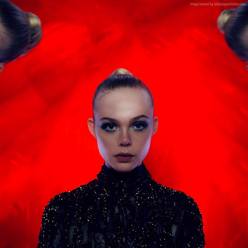 Description: A woman with a bun in her hair and a black dress with a red background and a red background.