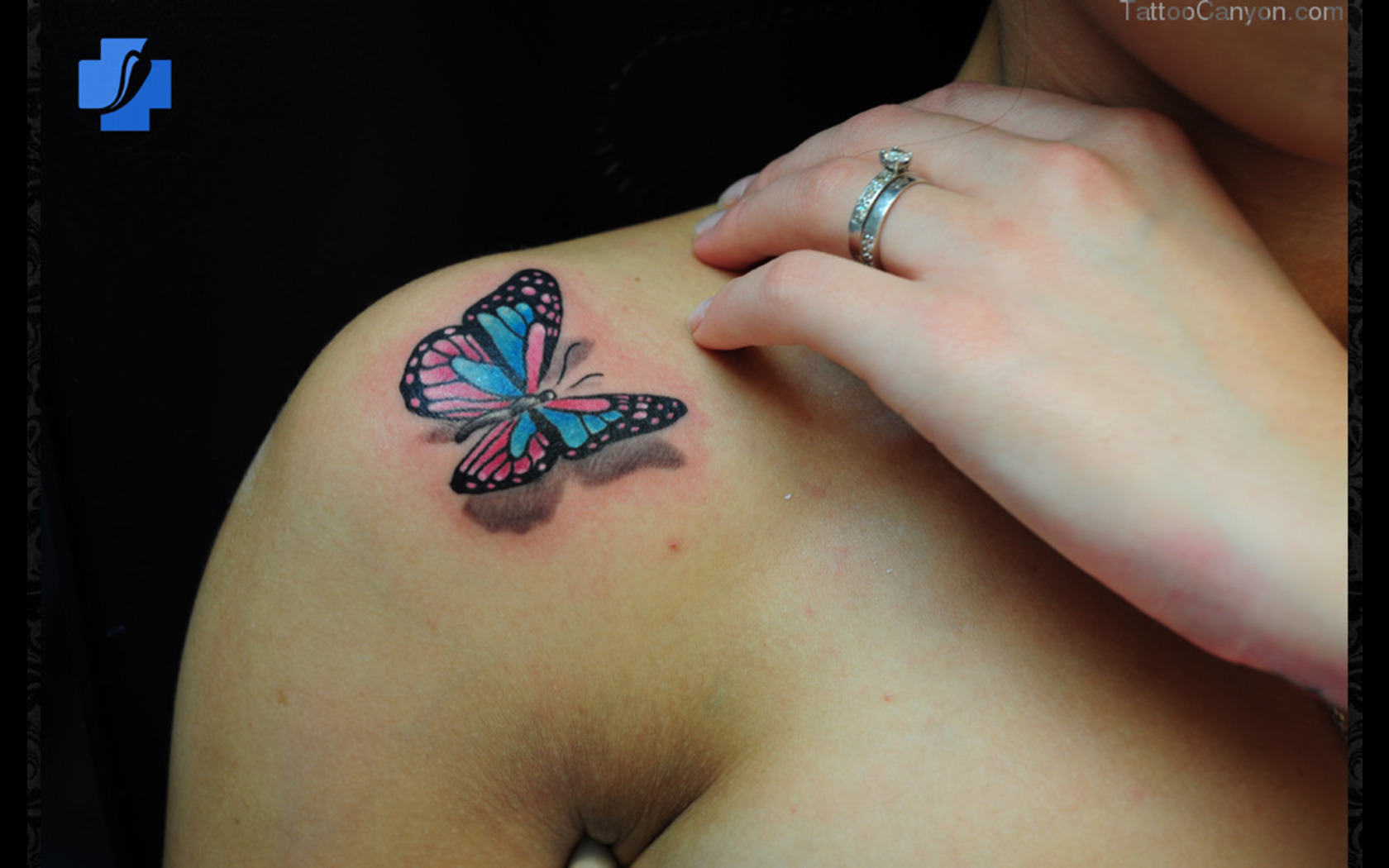 Description: A woman with a butterfly tattoo on her shoulder and shoulder tattoo on her left arm and shoulder tattoo on her left arm.