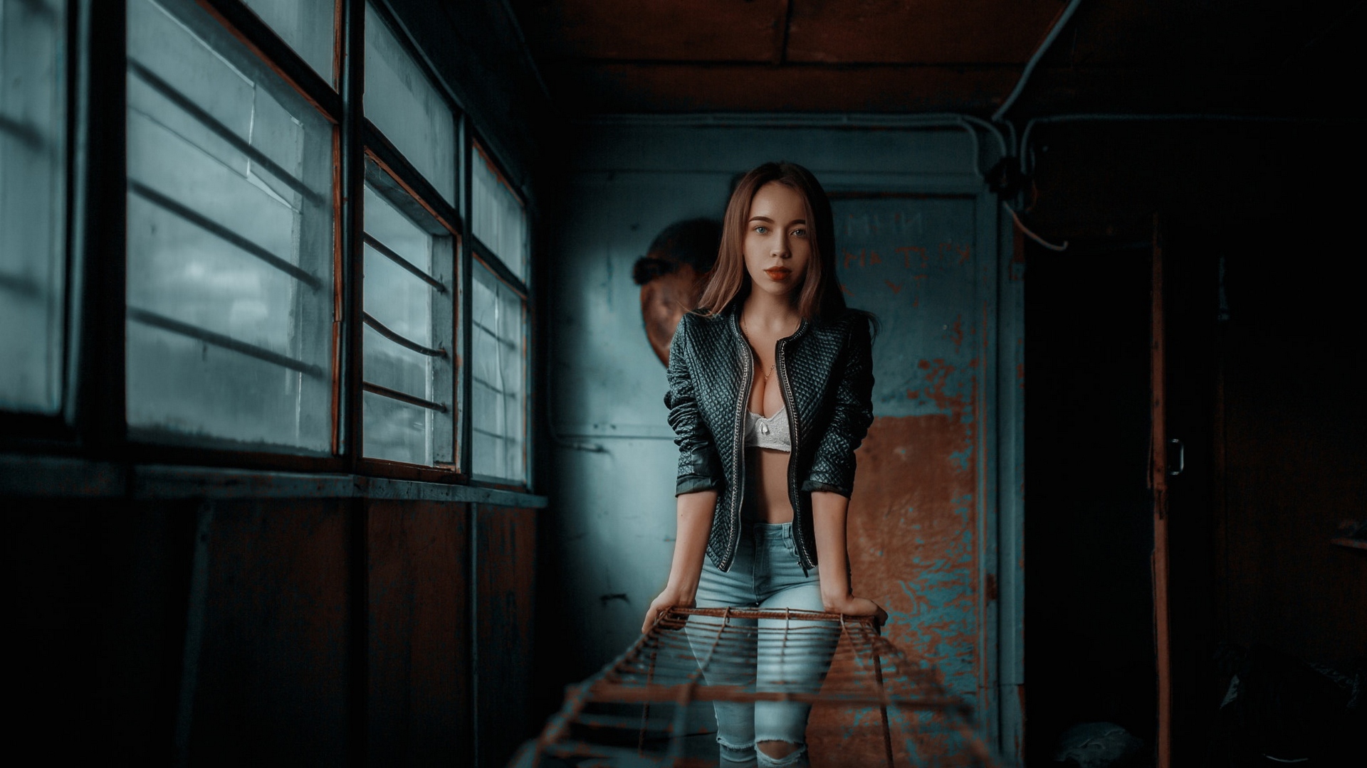 Description: A woman standing in a room with a cage in her hand and a man behind her looking at her.