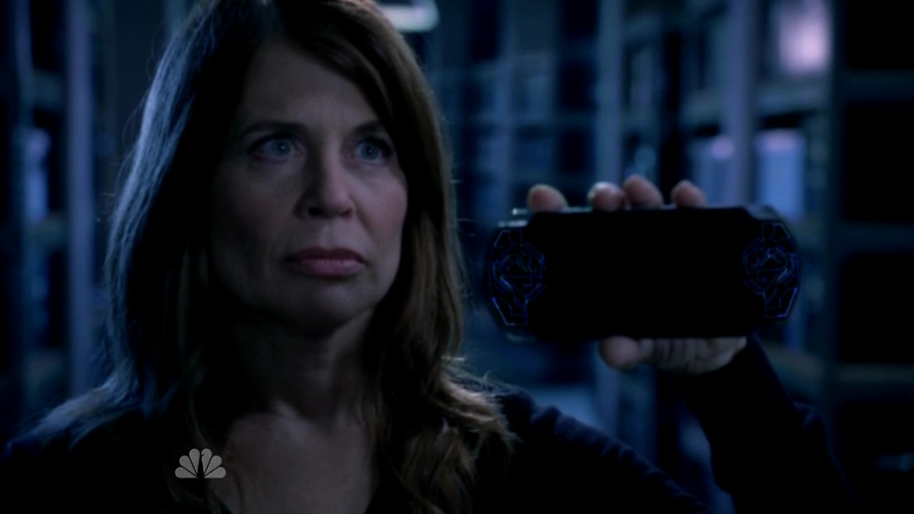 Description: A woman holding a camera in her hand in a dark room with a light on the ceiling and a building in the background.