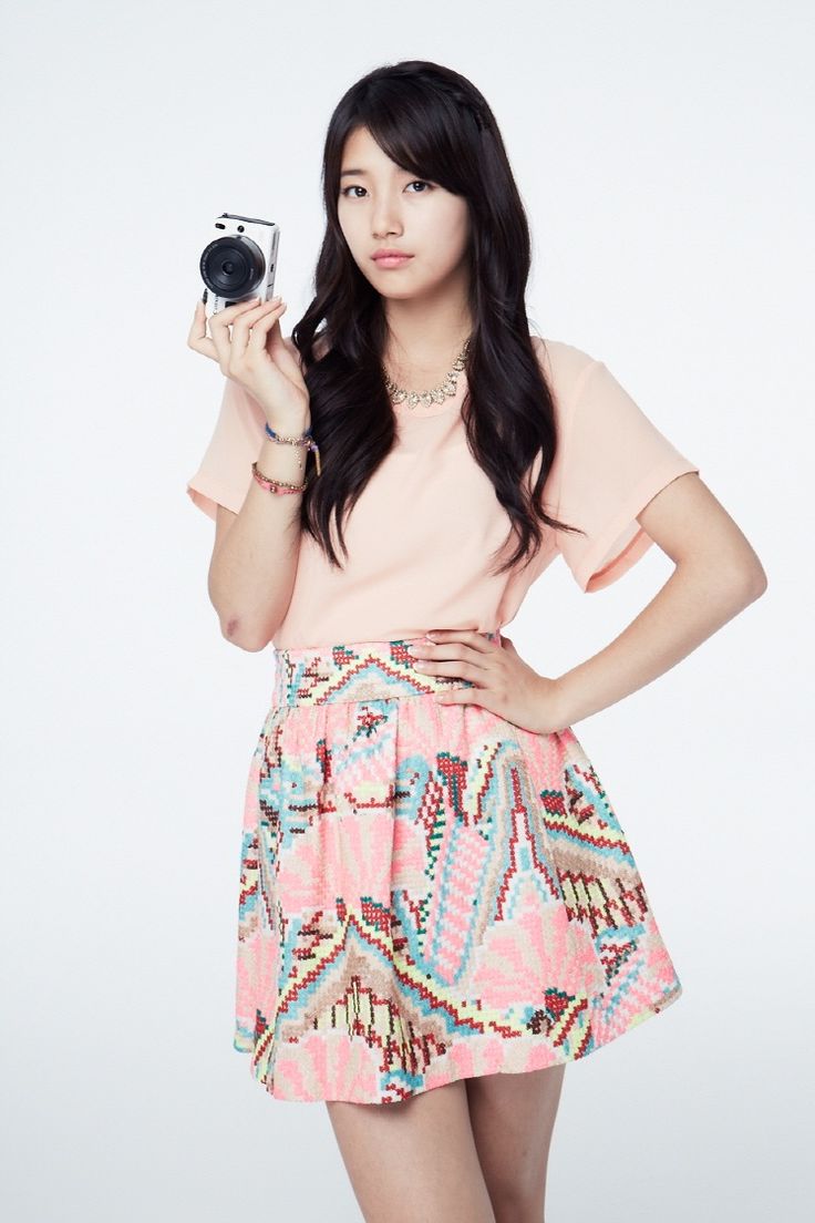 Description: A woman holding a camera and posing for a picture in a pink dress with a pink top and a pink skirt.