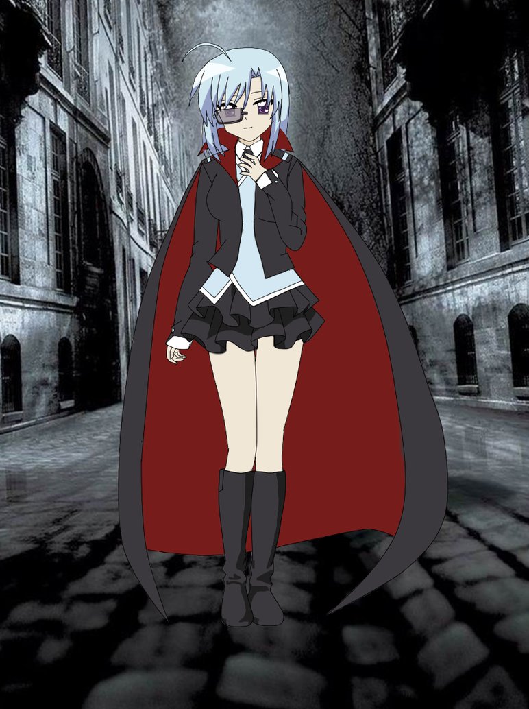 Description: A woman in a cape and skirt standing in a street with a building in the background and a dark alley.
