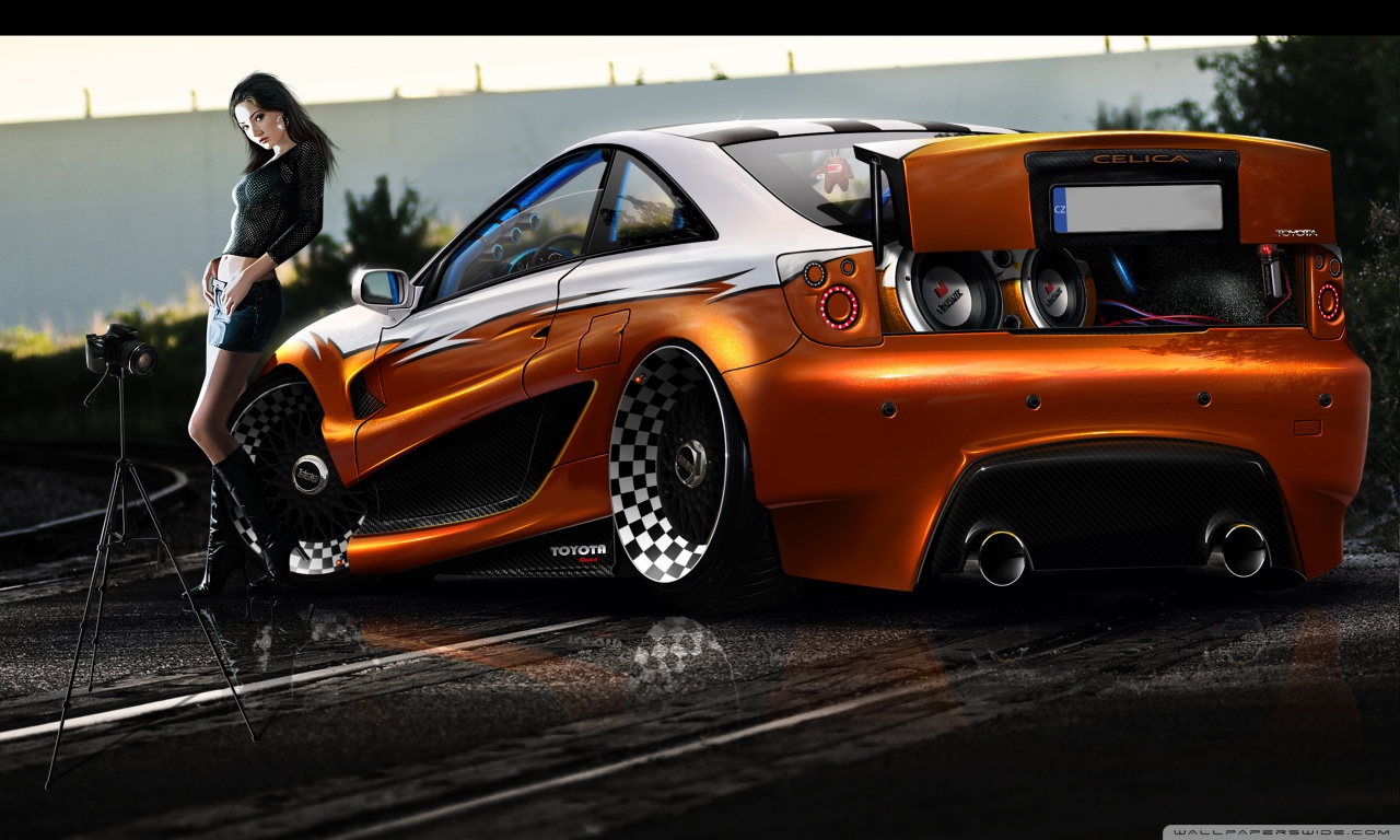 Description: A woman standing next to a car with a checkered design on it's side and a bike on the back.