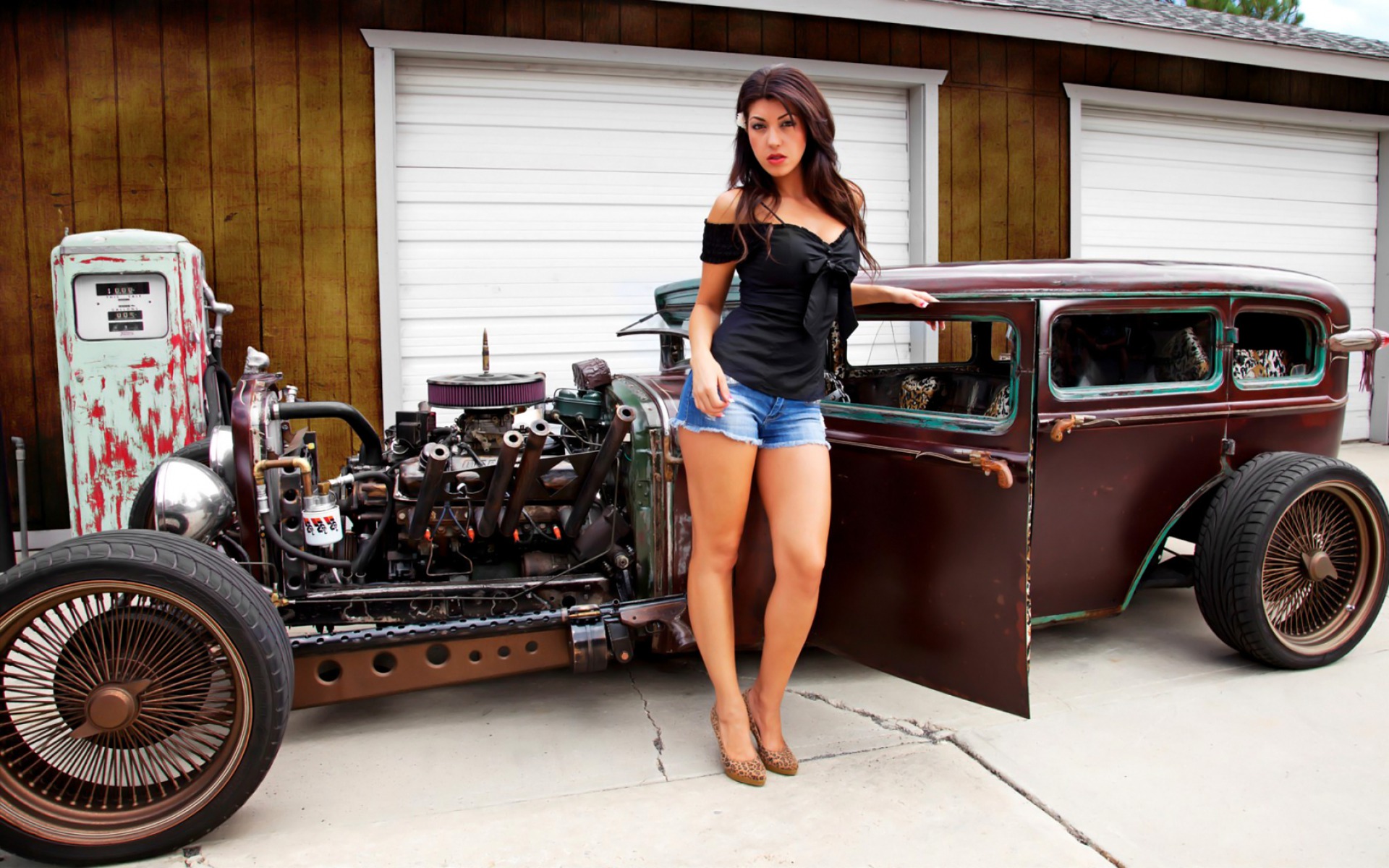 Description: A woman standing next to a car with a hood up and a hood up on it's side.