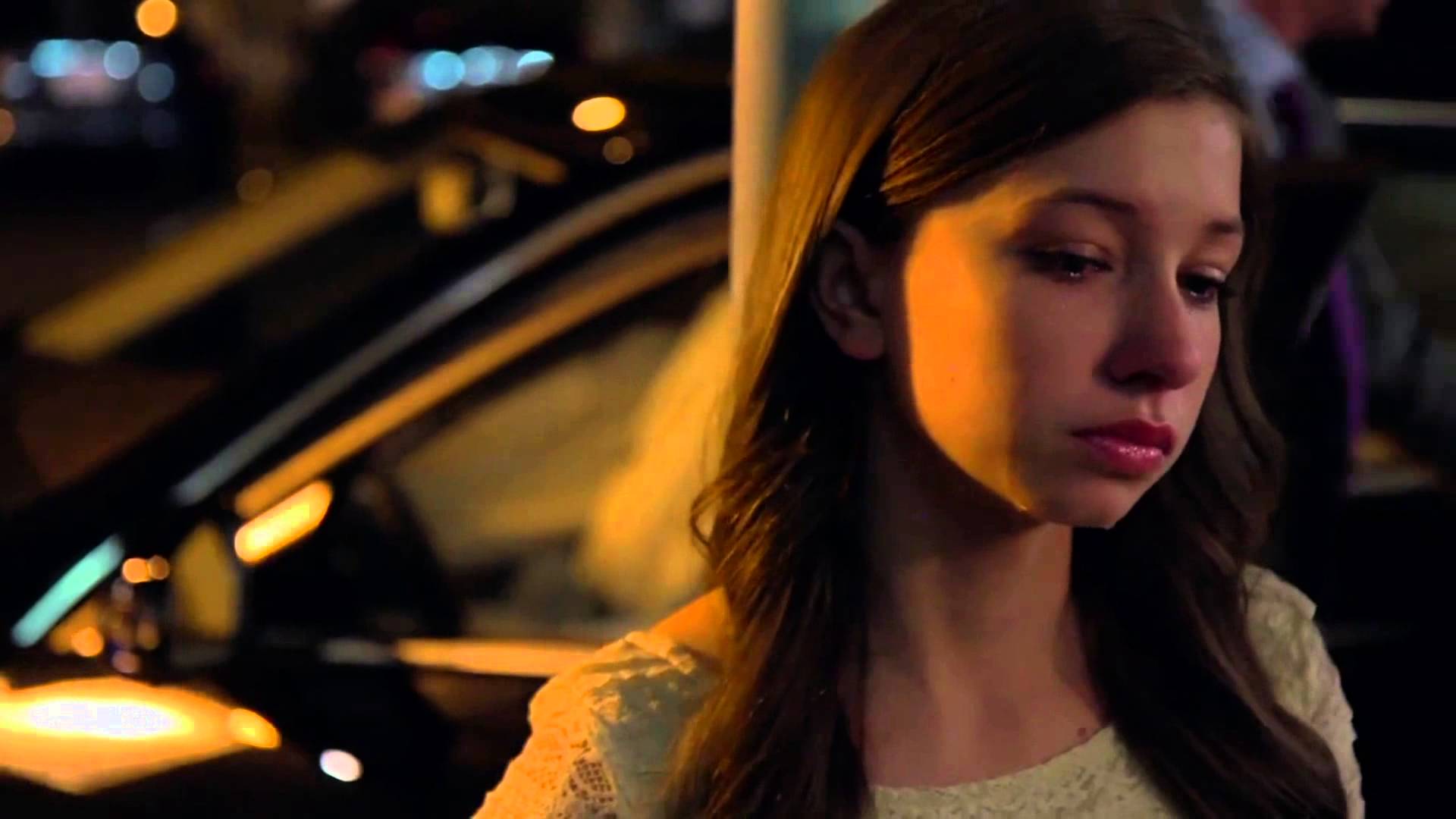 Description: A woman standing next to a car on a street at night time with a cell phone in her hand.