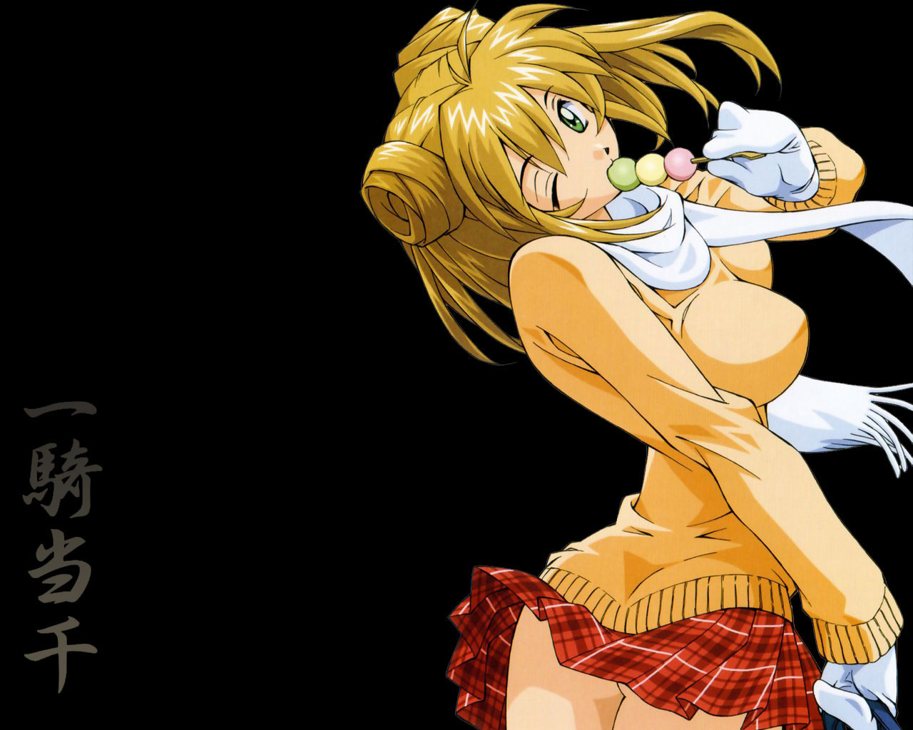 Description: A woman in a skirt and a shirt with a cat on her back and a black background with chinese characters.