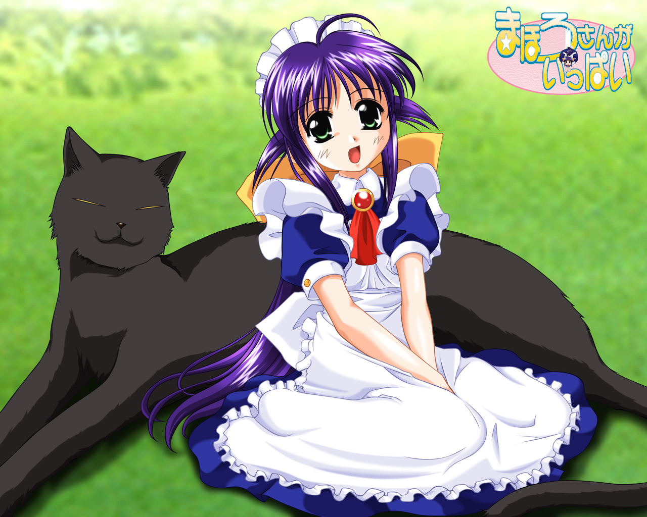 Description: A woman sitting on a cat in a field with a black cat behind her and a green field behind her.