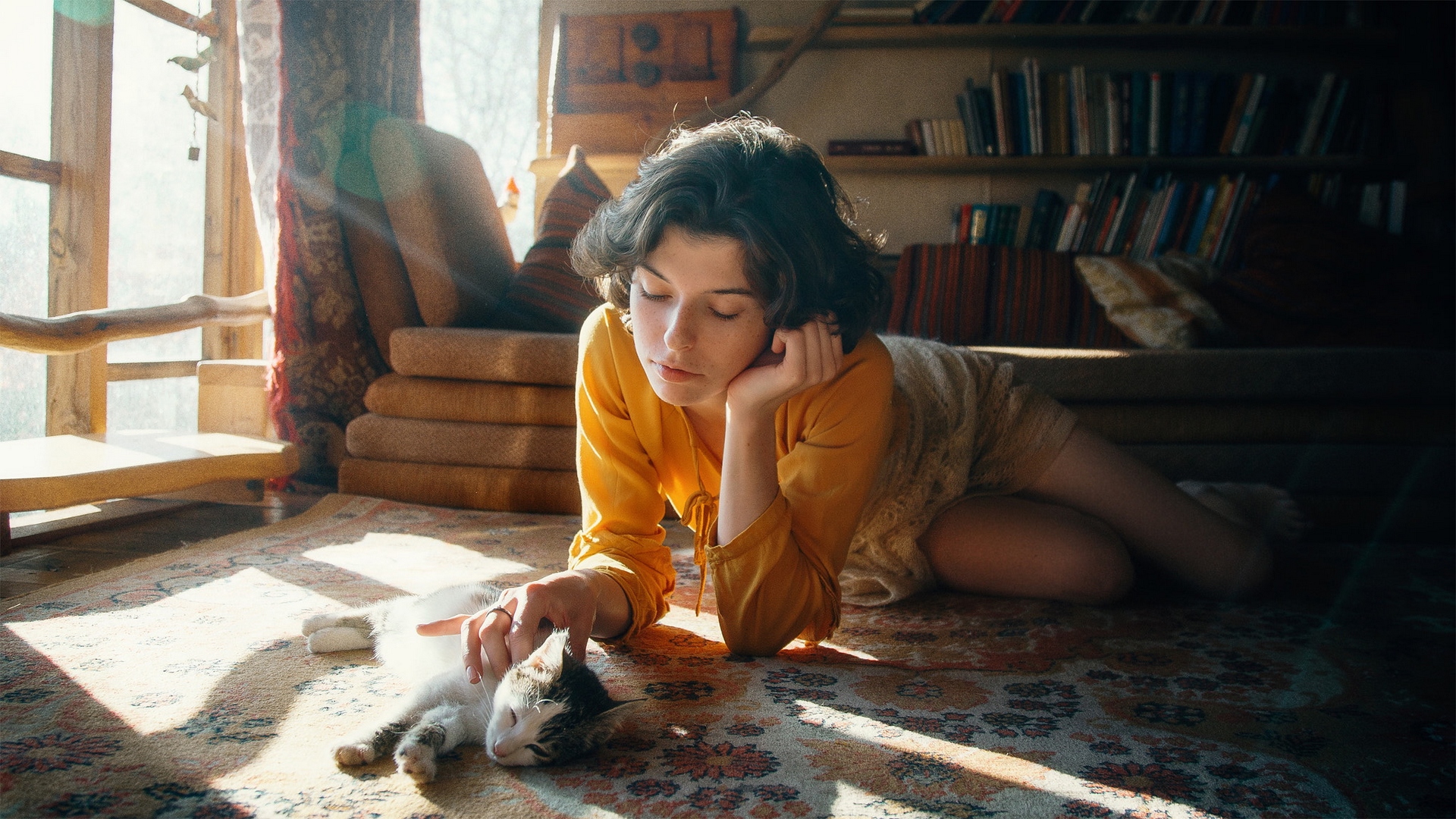 Description: A woman laying on the floor with a cat on her lap and a bookcase in the background with a window.