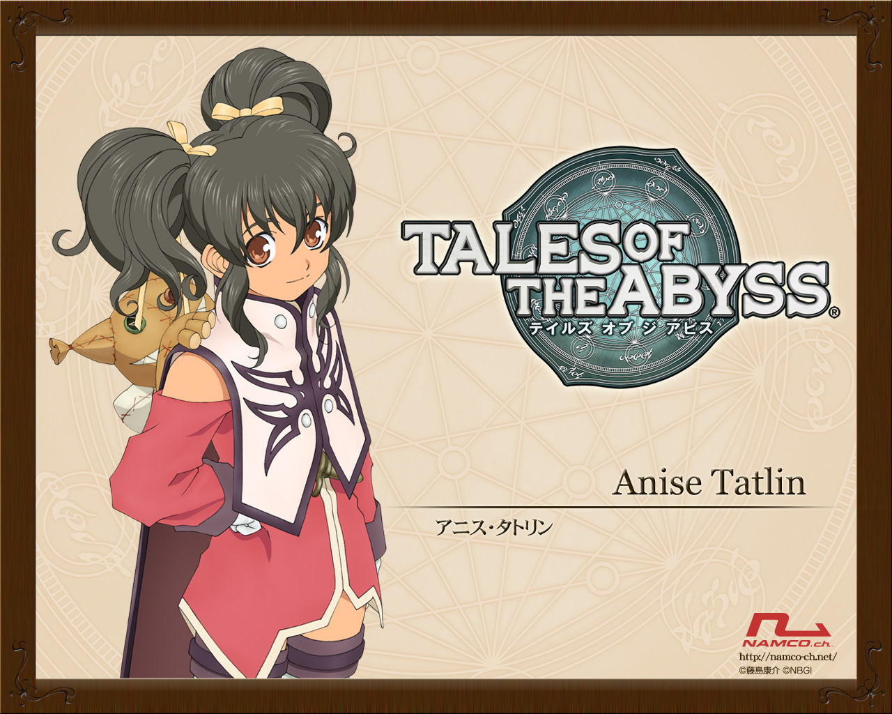 Description: A woman holding a cat in her hand and a sign that says tales of the abysss on it.