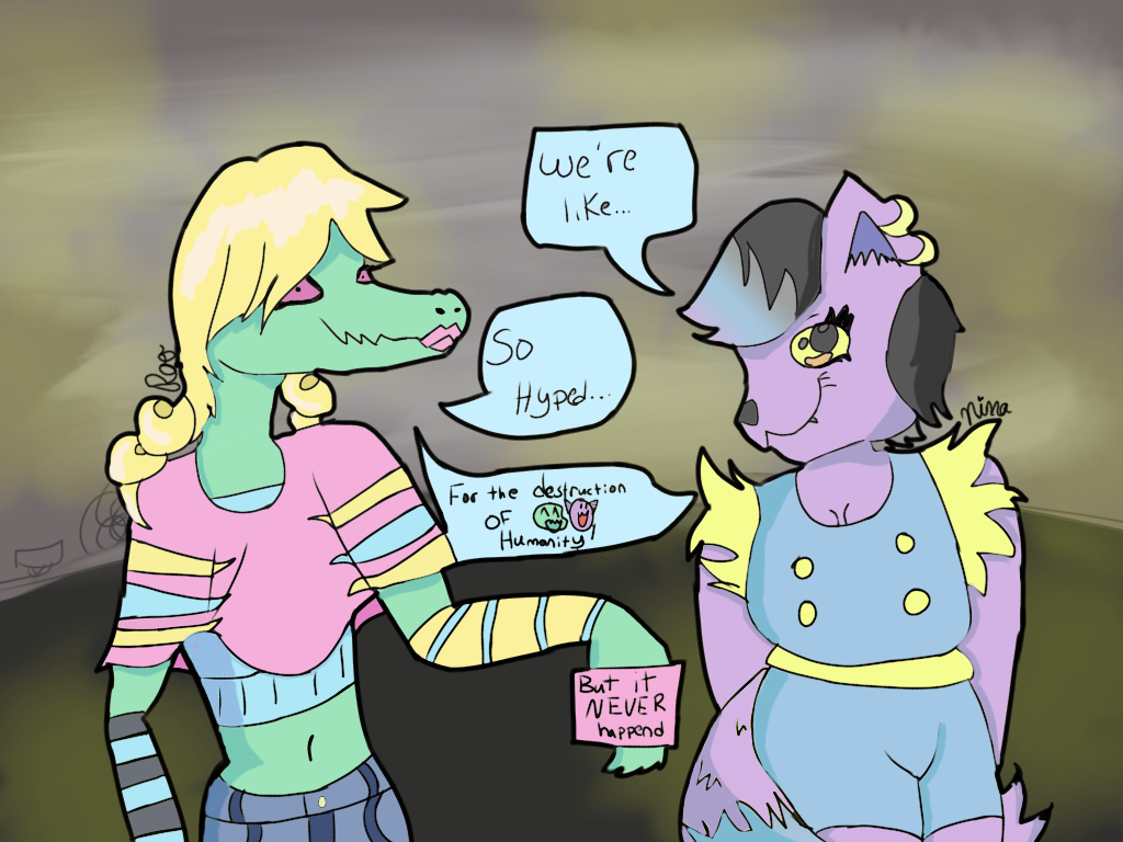 Description: A cartoon of a woman talking to a cat with a sign in her hand that says we're okay.
