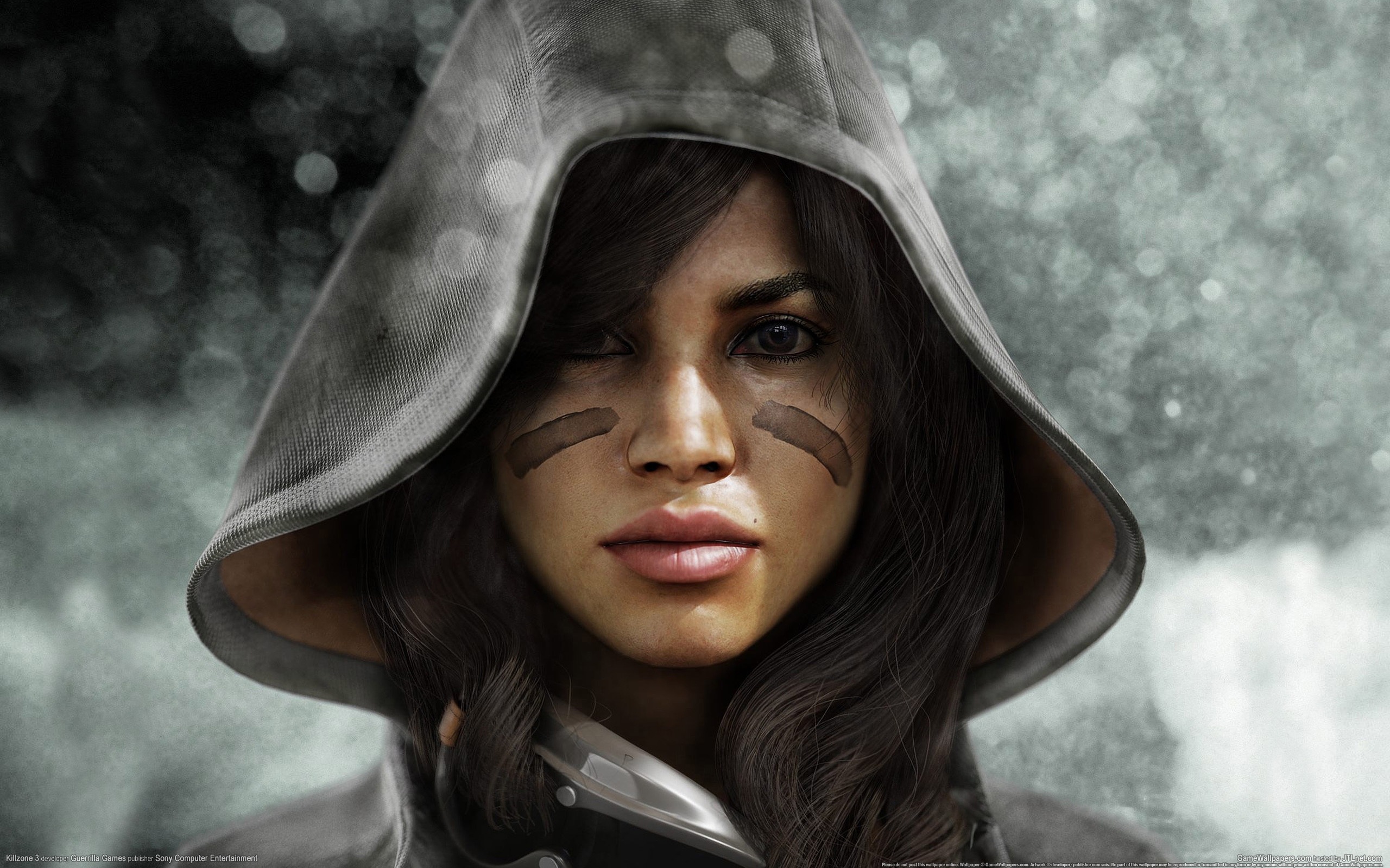 Description: A woman with a cat face painted on her face and a hood over her head.