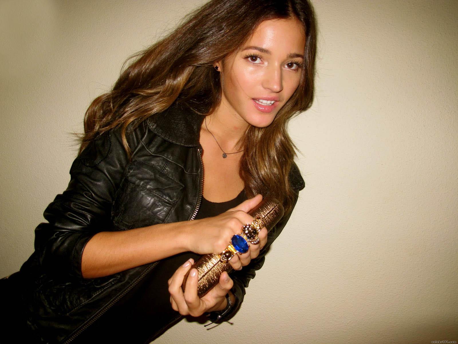 Description: A woman holding a cell phone and a purse in her hand and a leather jacket on her shoulder and a white wall behind her.