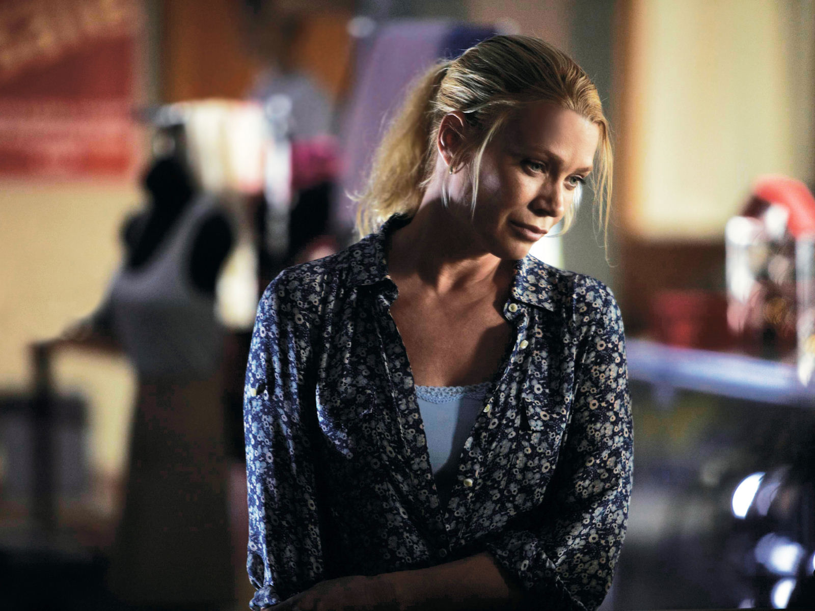 Description: A woman standing in a room with a cell phone in her hand and a dress on a mannequin behind her.