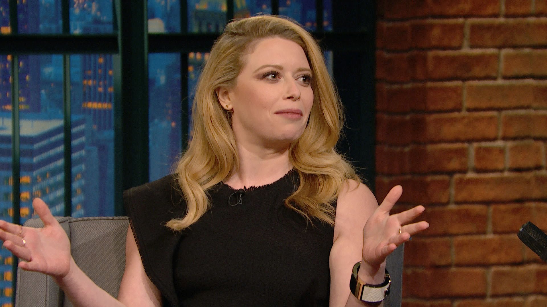 Description: A woman sitting in a chair with her hands out and a brick wall behind her and a microphone in front of her.