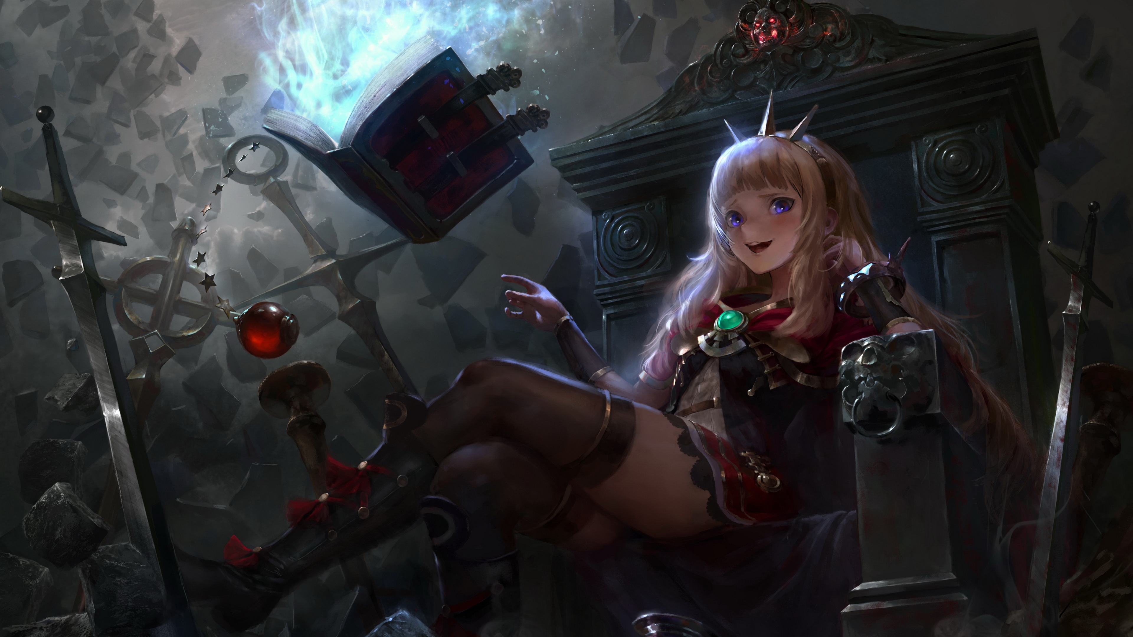 Description: A woman sitting on a chair with a knife in her hand and a clock in the background with a light shining on her.