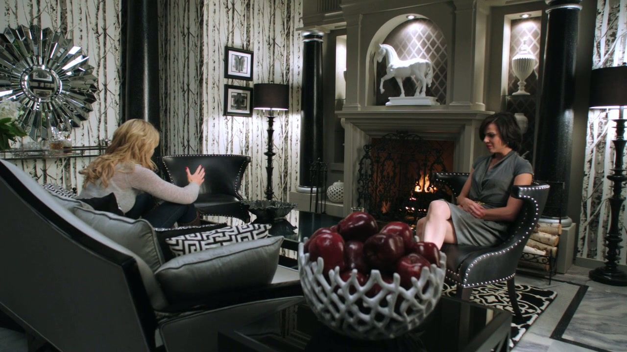 Description: A woman sitting in a chair next to a man in a living room with a fireplace and a vase of apples.