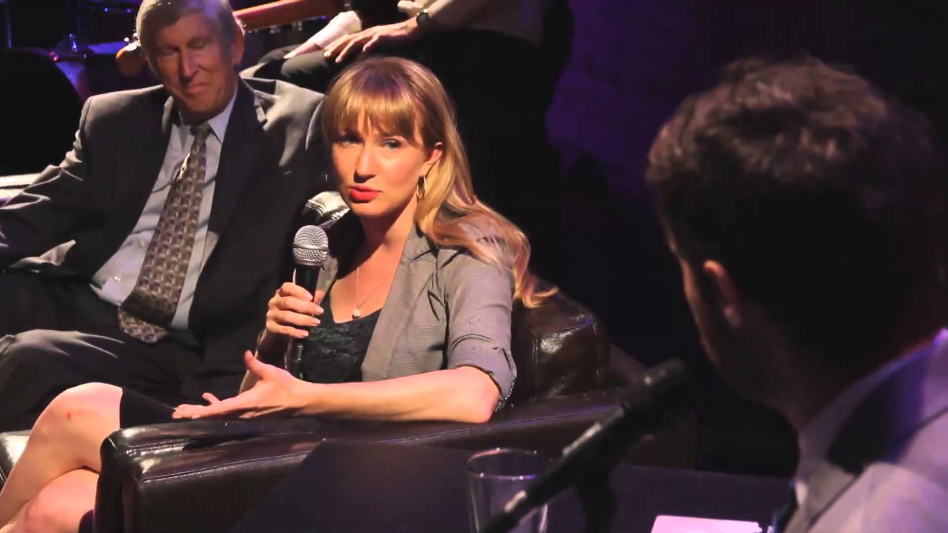 Description: A woman sitting in a chair holding a microphone in her hand and a man standing behind her talking into a microphone.