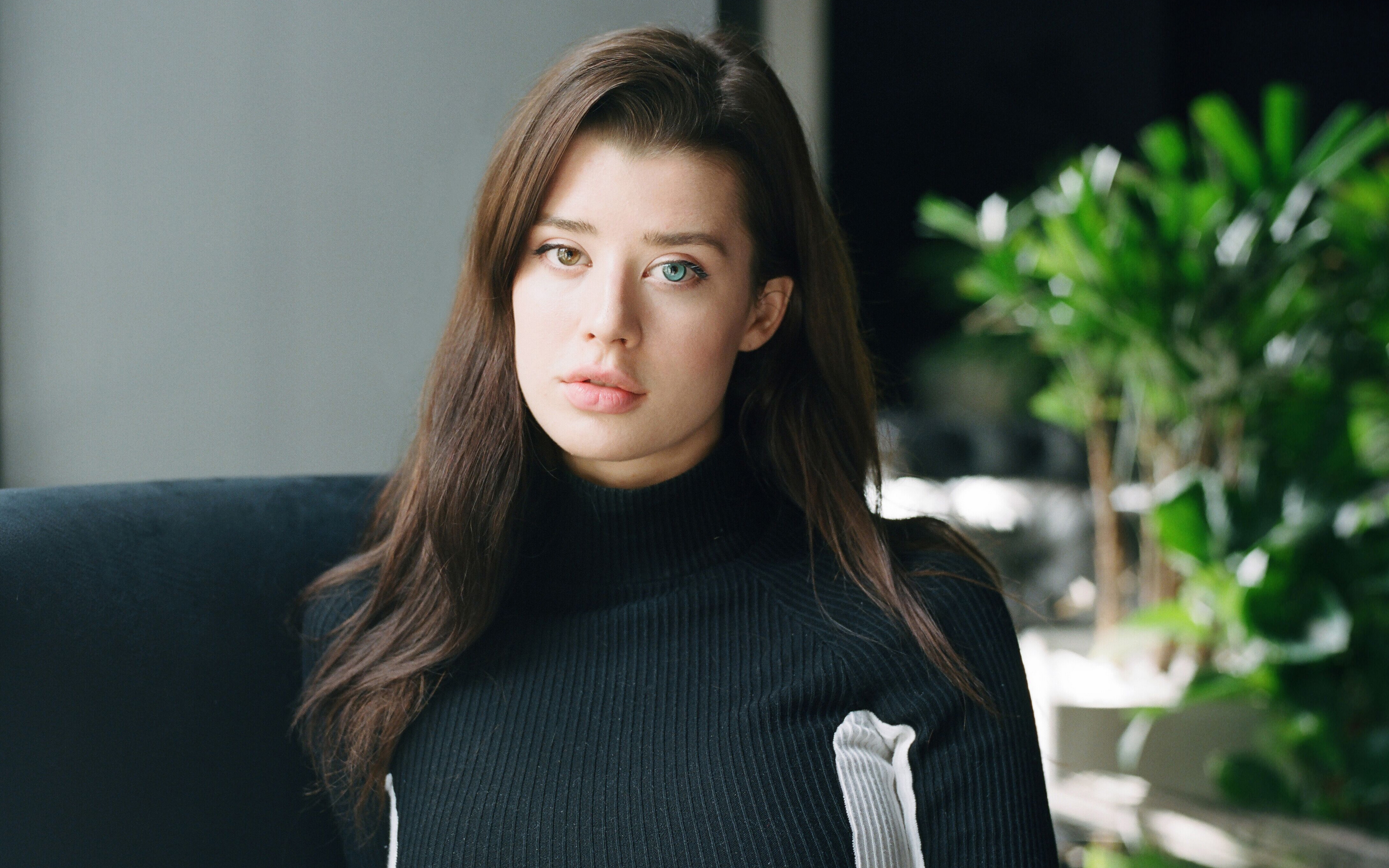 Description: A woman sitting in a chair with a plant in the background and a potted plant behind her.