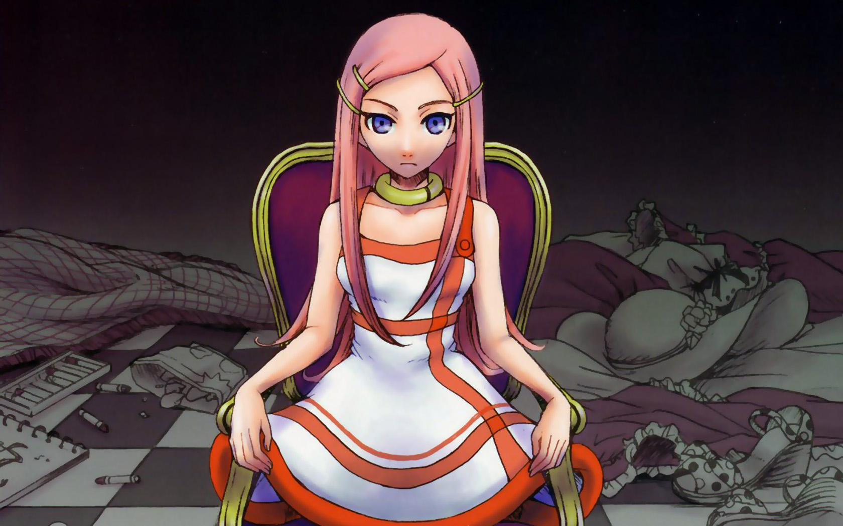 Description: A woman sitting in a chair with a red and white dress on and a red and white checkered floor.