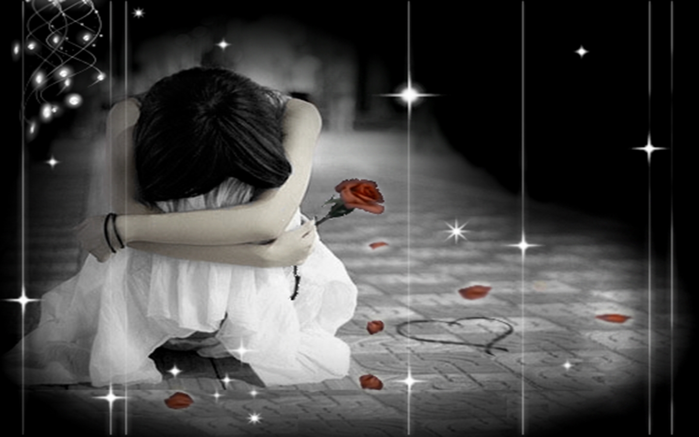 Description: A woman sitting on a chair with a rose in her hand and a black background with stars and a light.