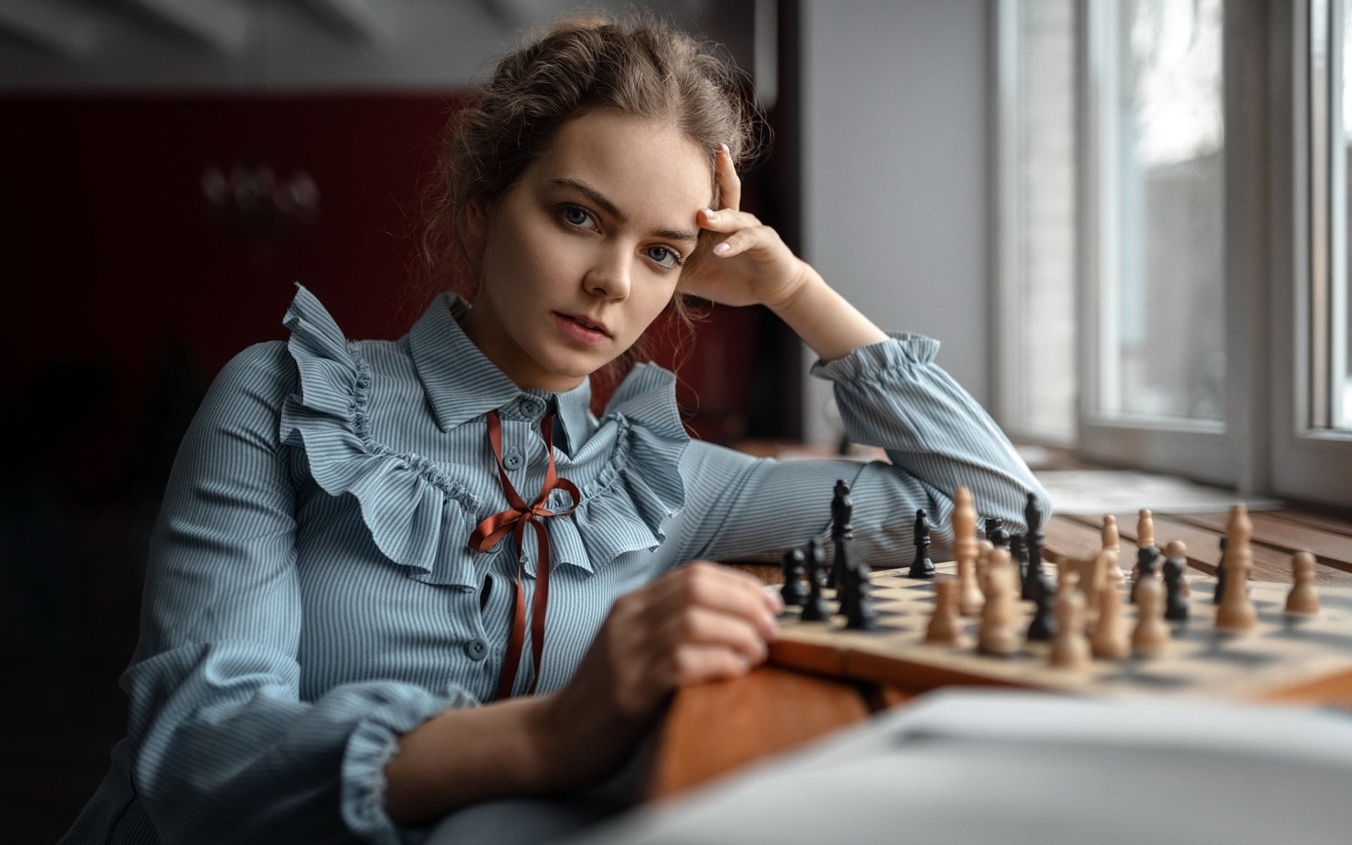 Description: A woman sitting at a table with a chess board and a game of chess on it.