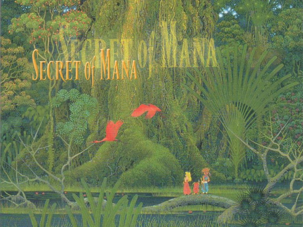 Description: A painting of a woman and child in a forest with a sign that says secret of manana on it.