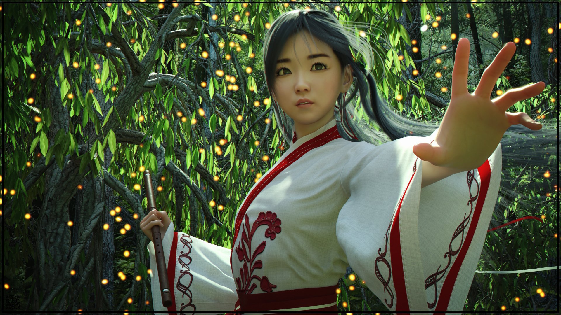 Description: A woman in a white and red outfit holding a stick in a forest with orange lights on the trees.