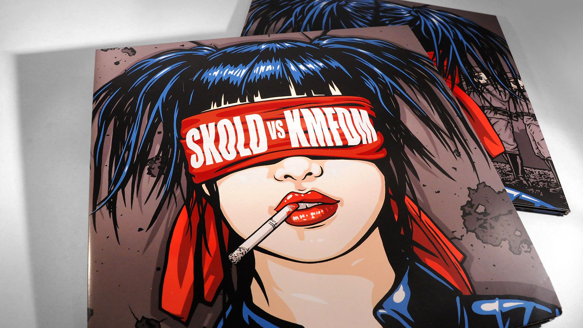 Description: A picture of a woman with a cigarette in her mouth and a head band on her head with the words skoold by karr.