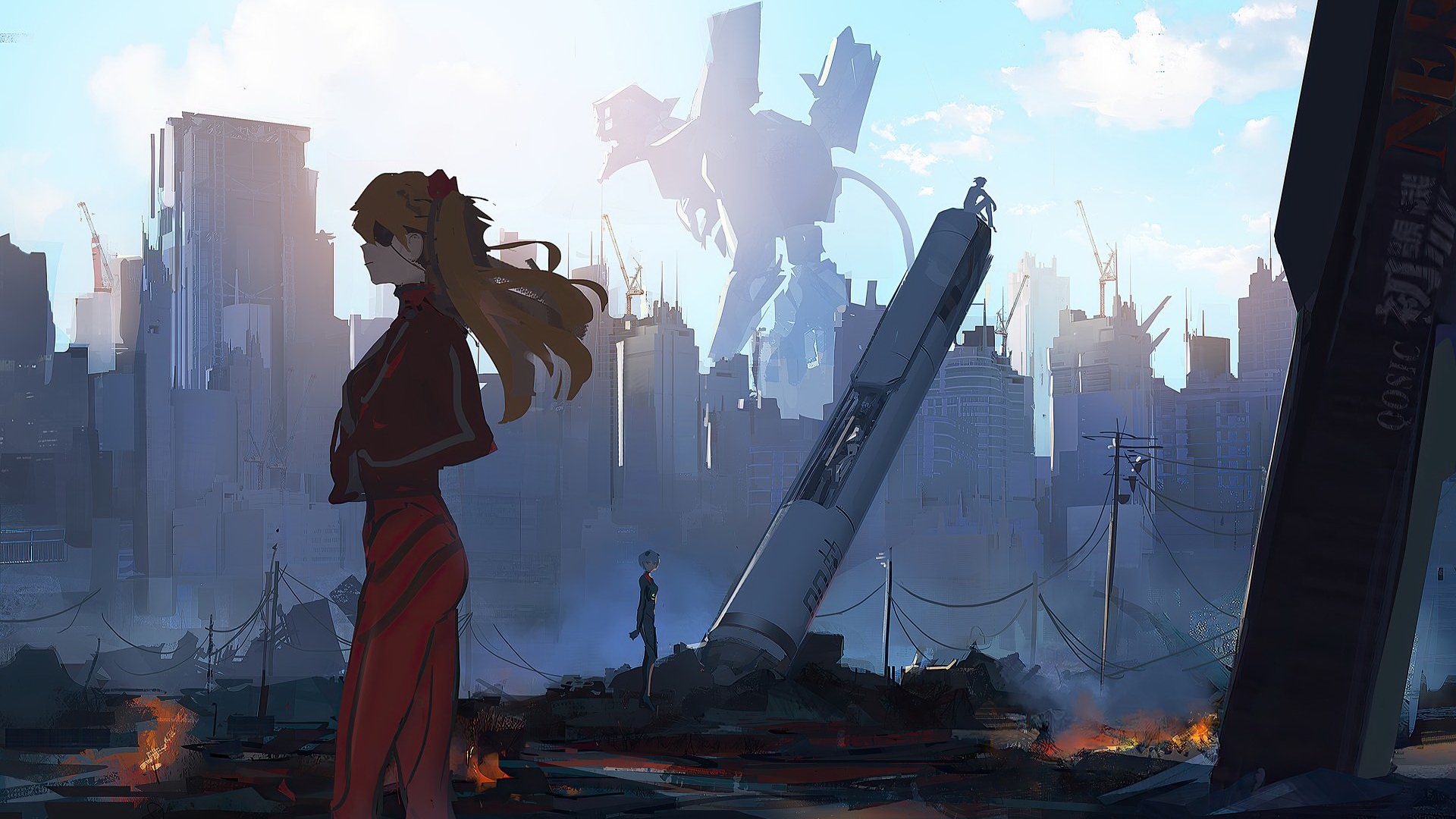 Description: A woman standing in front of a city with a giant object in the background and a giant object in the foreground.